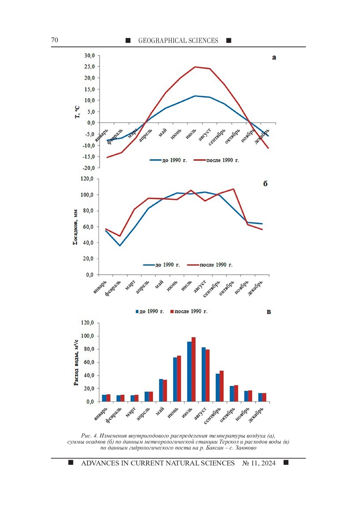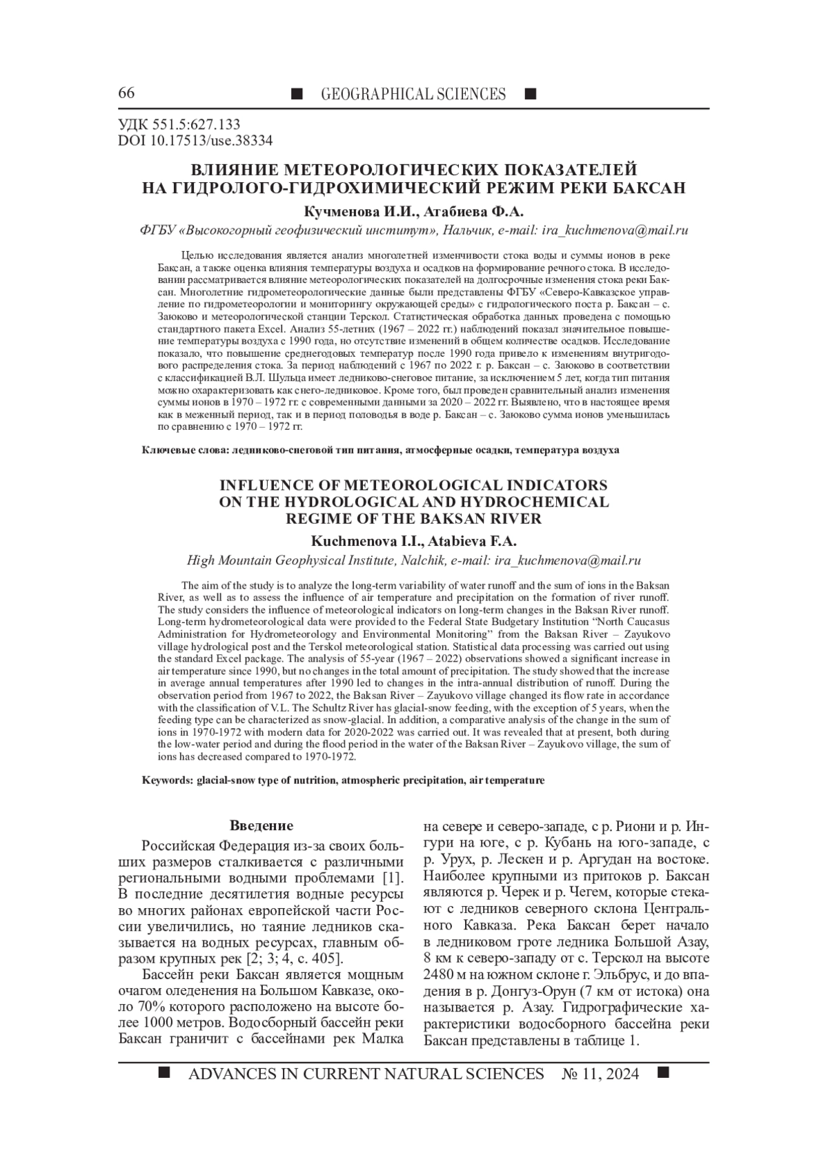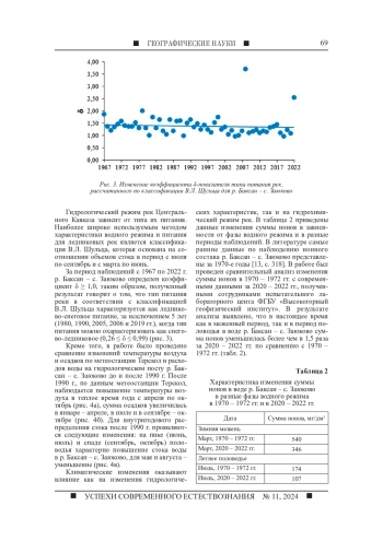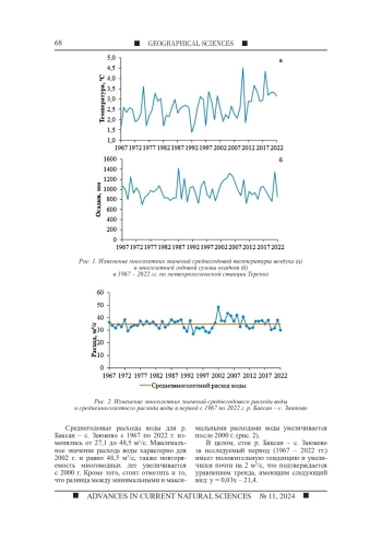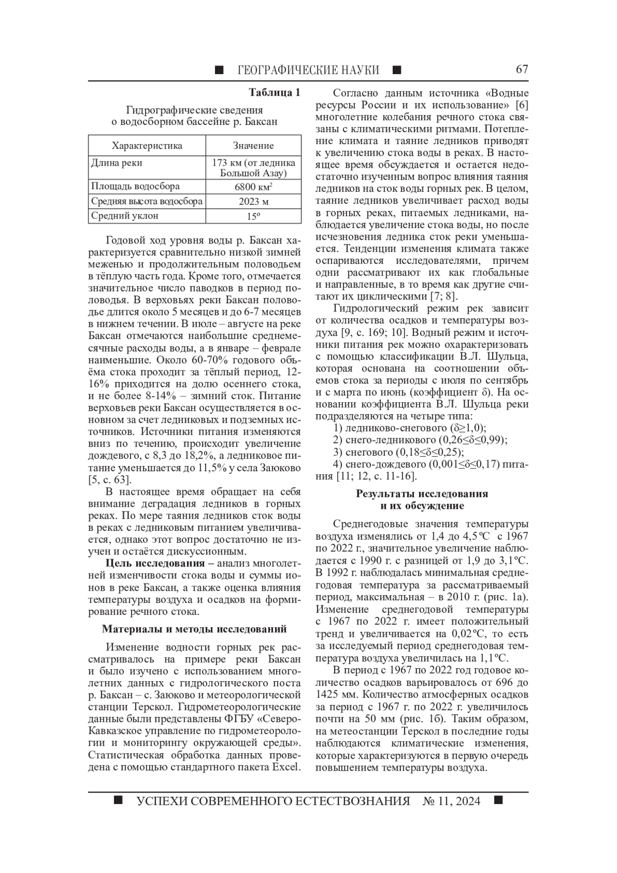Целью исследования является анализ многолетней изменчивости стока воды и суммы ионов в реке Баксан, а также оценка влияния температуры воздуха и осадков на формирование речного стока. В исследовании рассматривается влияние метеорологических показателей на долгосрочные изменения стока реки Баксан. Многолетние гидрометеорологические данные были представлены ФГБУ «Северо-Кавказское управление по гидрометеорологии и мониторингу окружающей среды» с гидрологического поста р. Баксан - с. Заюково и метеорологической станции Терскол. Статистическая обработка данных проведена с помощью стандартного пакета Excel. Анализ 55-летних (1967 - 2022 гг.) наблюдений показал значительное повышение температуры воздуха с 1990 года, но отсутствие изменений в общем количестве осадков. Исследование показало, что повышение среднегодовых температур после 1990 года привело к изменениям внутригодового распределения стока. За период наблюдений с 1967 по 2022 г. р. Баксан - с. Заюково в соответствии с классификацией В. Л. Шульца имеет ледниково-снеговое питание, за исключением 5 лет, когда тип питания можно охарактеризовать как снего-ледниковое. Кроме того, был проведен сравнительный анализ изменения суммы ионов в 1970 - 1972 гг. с современными данными за 2020 - 2022 гг. Выявлено, что в настоящее время как в меженный период, так и в период половодья в воде р. Баксан - с. Заюково сумма ионов уменьшилась по сравнению с 1970 - 1972 гг.