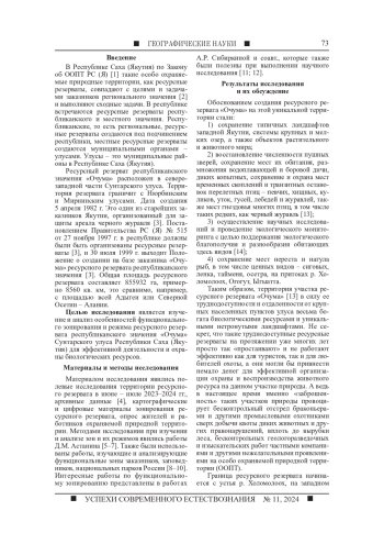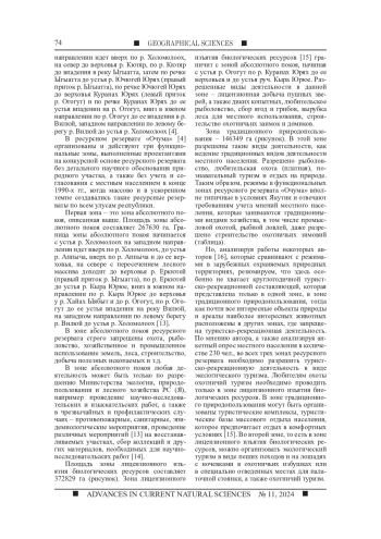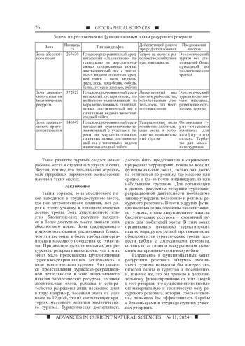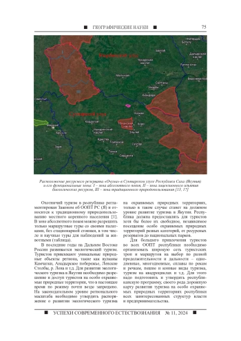 Целью статьи является анализ и изучение особенностей функционального зонирования и их режимов ресурсного резервата регионального значения «Очума» Сунтарского улуса (района) Якутии, для эффективной деятельности и охраны биологических ресурсов. Материалом исследования явились полевые исследования ресурсного резервата в июне - июле 2023-2024 гг., архивные данные, опрос населения, картографические и цифровые материалы зонирования ресурсного резервата, опрос жителей и работников охраняемой природной территории. В статье подробно описана граница ресурсного резервата и трех его функциональных зон - зоны традиционного природопользования, лицензионного изъятия биологических ресурсов и абсолютного покоя. Режимы и задачи в этих зонах абсолютно различны. В зоне абсолютного покоя, например, строго запрещено присутствие даже туристов, что не развивает на данном, самом интересном и уникальном участке природы туристского потенциала, основное материальное обеспечение ресурсного резервата. Слабо представлены туристские тропы по ресурсным резерватам, которые в будущем могли бы стать одним из основных направлений в функционировании резервата. Так, одним из направлений в ресурсных резерватах Якутии мог бы стать охотничий туризм для любителей охоты. В данном ресурсном резервате, очень богатом фауной, только местным жителям наслега или улуса разрешается охотиться в зоне лицензионного изъятия биологических ресурсов, тогда как любителям охоты из других улусов или районов это строго запрещено, что тоже противоречит развитию туризма в данном ресурсном резервате. В ходе изучения и анализа функциональных зон ресурсного резервата установлено, что в их зонах слабо представлена туристско-рекреационная деятельность, которая в наше время является одной из главных экономических составляющих и обеспечивает эффективность функционирования охраняемой природной территории. Так, например, разрешение охотничьего туризма любителям охоты из других мест повысило бы в разы посещаемость и экономическую стабильность ресурсного резервата.