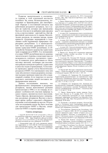 1. Закон РС (Я) 910-З № 731-IV от 01.03.2011 г. “Об особо охраняемых природных территориях РС (Я)” [Электронный ресурс]. URL: https://minpriroda.sakha.gov.ru/zakon-rsja-910-z-731-iv-ot-01032011-g-ob-osobo-ohranjaemyh-prirodnyh-territorijah-rsja (дата обращения: 24.09.2024).