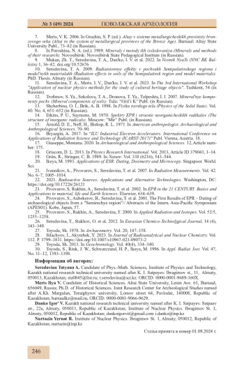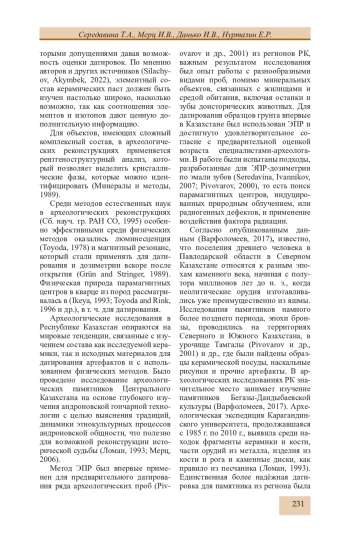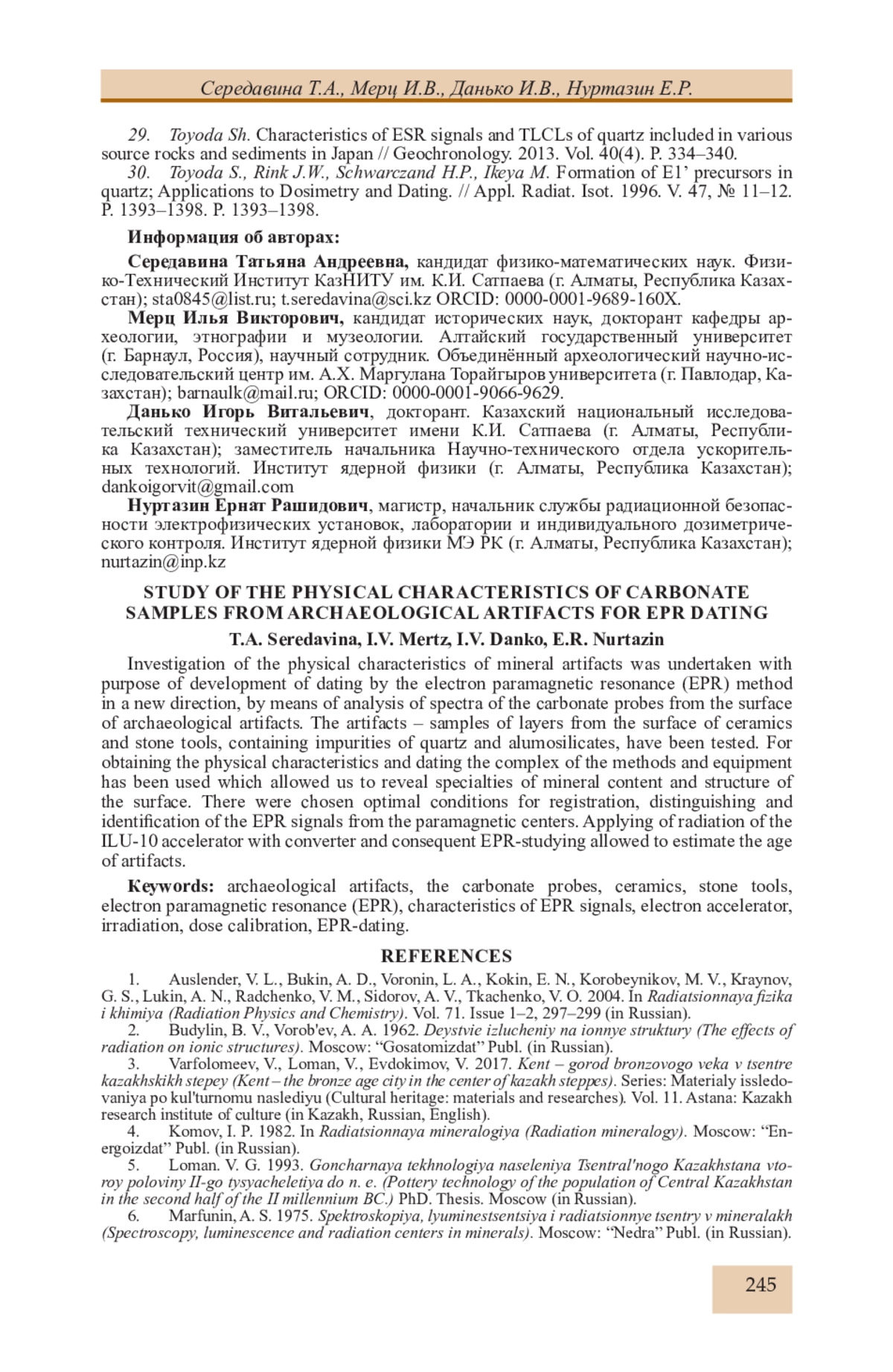 Исследование физических характеристик минеральных артефактов предпринято с целью развития датирования методом электронного парамагнитного резонанса (ЭПР) в новом направлении, путём анализа спектров проб карбонатов с поверхности археологических предметов. Исследованы артефакты - пробы наслоений с керамики и каменных орудий с содержанием кварца и алюмосиликатов. Для получения физических характеристик и датирования сформирован комплекс методов и аппаратуры, который позволил выявить особенности минерального состава и структуры поверхности. Выбраны оптимальные условия для регистрации, разделения и идентификации сигналов ЭПР от парамагнитных центров. Применение воздействия тормозного излучения ускорителя ИЛУ-10 ИЯФ РК и последующее ЭПР исследование позволили оценить возраст артефактов.