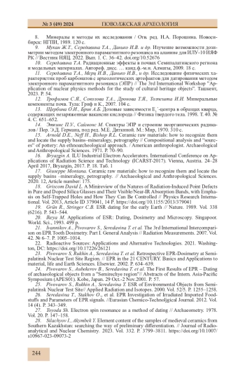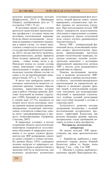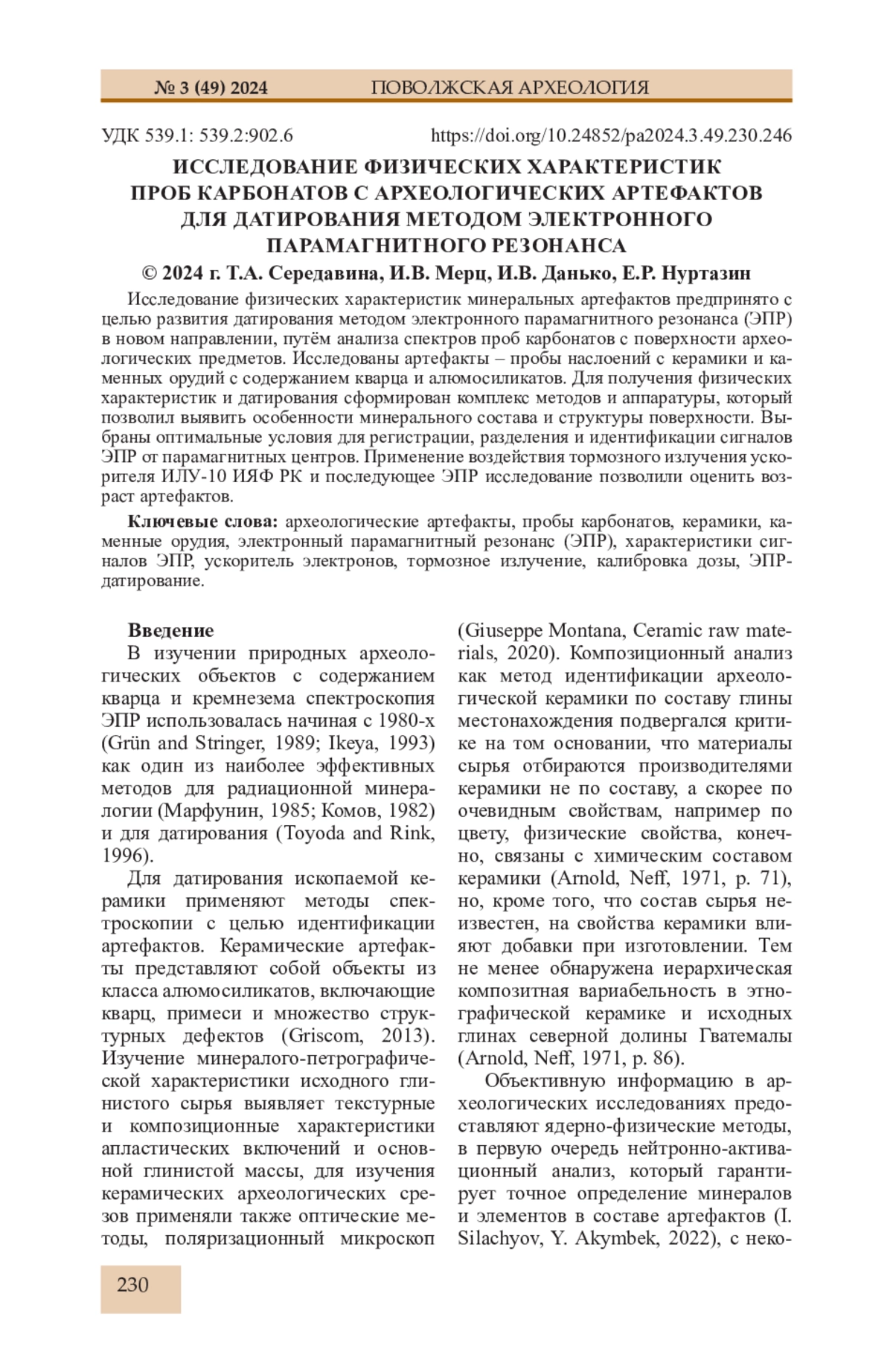 СЕРЕДАВИНА Т. А., МЕРЦ И. В., ДАНЬКО И. В., НУРТАЗИН Е. Р. ИССЛЕДОВАНИЕ ФИЗИЧЕСКИХ ХАРАКТЕРИСТИК ПРОБ КАРБОНАТОВ С АРХЕОЛОГИЧЕСКИХ АРТЕФАКТОВ ДЛЯ ДАТИРОВАНИЯ МЕТОДОМ ЭЛЕКТРОННОГО ПАРАМАГНИТНОГО РЕЗОНАНСА // ПОВОЛЖСКАЯ АРХЕОЛОГИЯ. 2024. № 3 (49)