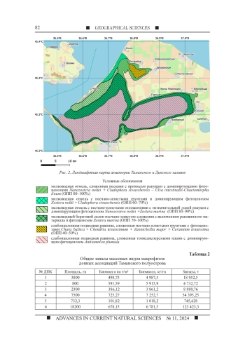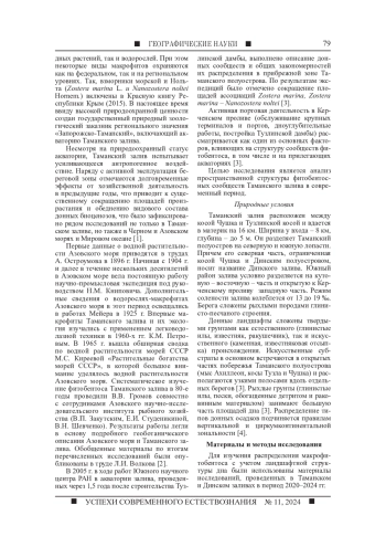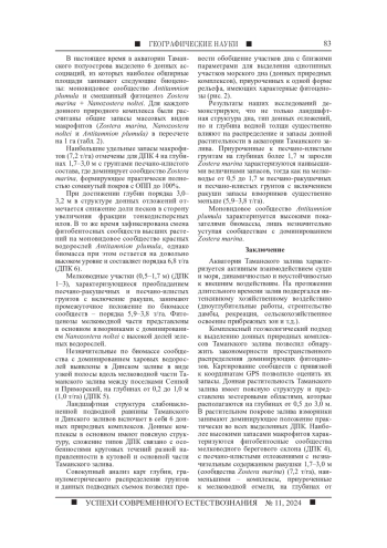 Цель исследования заключалась в анализе пространственной структуры распределения фитобентосных сообществ Таманского залива в современный период. Приводятся комплексные данные о структуре донных грунтов, видовом составе и структуре макрофитобентоса Таманского залива. Материалы получены на основе наблюдений в акватории залива в течение 2020-2024 гг. на заложенных станциях, а также вдоль трансект сплошного наблюдения. Включение в анализ материалов батиметрии, гранулометрического состава грунтов и данных подводных съемок позволило определить участки дна со сходными параметрами. Это послужило основой для выделения однотипных участков морского дна (донных природных комплексов), приуроченных к одной форме рельефа, имеющих сходные по составу донные осадки и доминирующие фитоценозы. В ландшафтной структуре Таманского и Динского заливов описаны 6 типов донных природных комплексов, расположенных в пределах слабонаклоненной песчано-илистой равнины. В ходе исследования были определены запасы сообществ макрофитов, выполнено сравнение количественных характеристик сообществ, обозначены фитобентосные сообщества мелководного берегового склона с песчано-илистыми отложениями, характеризующиеся максимальными величинами запасов биомассы. Минимальные показатели биомассы установлены для природных донных комплексов, приуроченных к мелководной отмели, на песчано-илистых грунтах с преобладанием харовых водорослей. В результате комплексного исследования была составлена ландшафтная карта типов донных природных комплексов изучаемого региона. Обсуждаются возможные геоэкологические причины выявленных закономерностей распределения сообществ.
