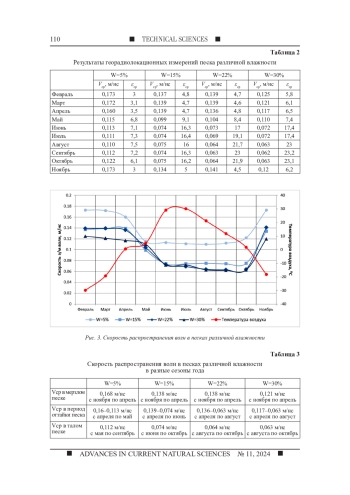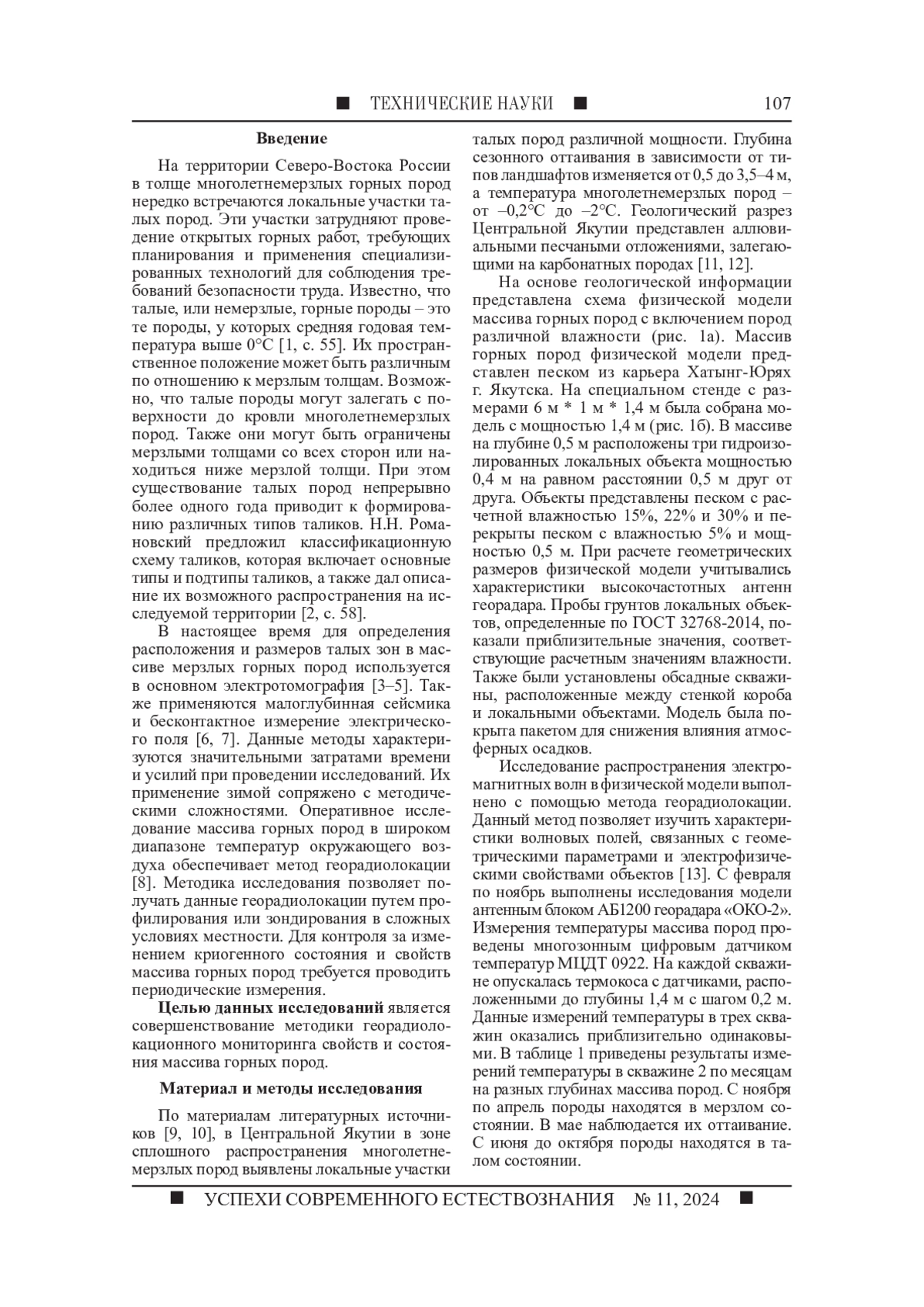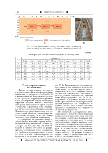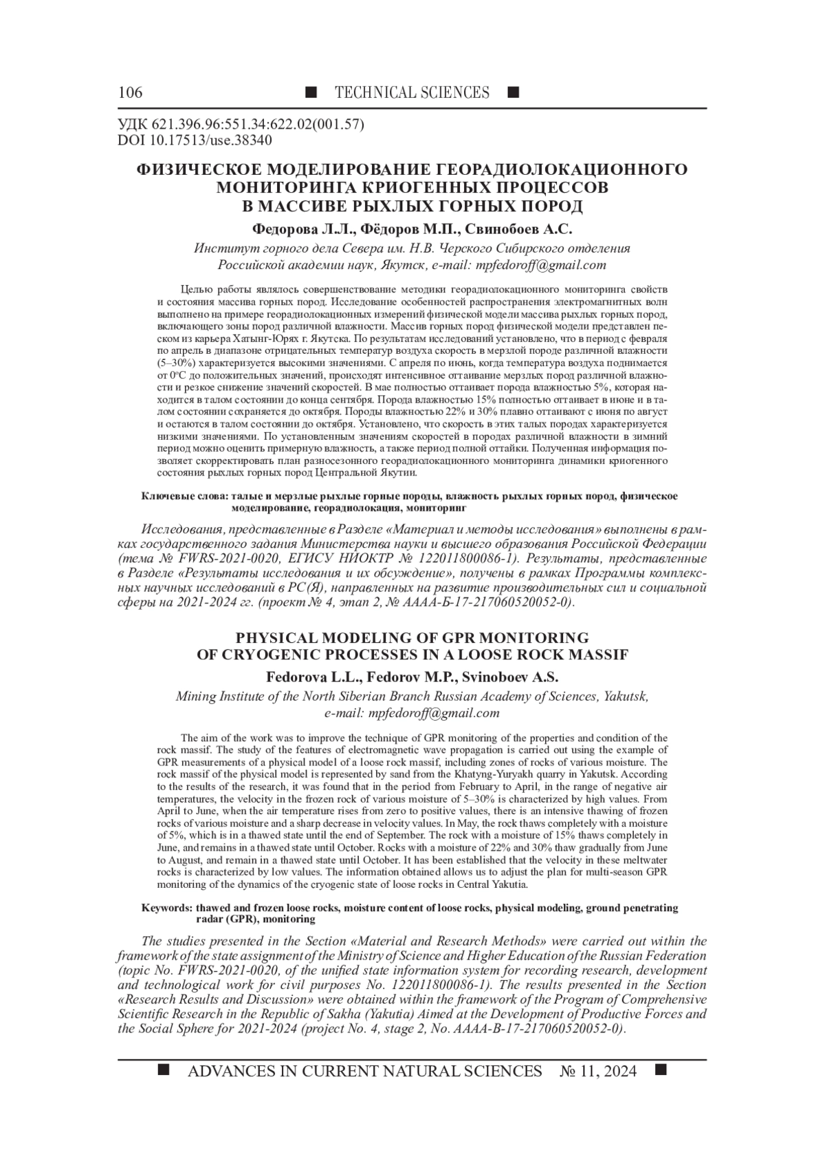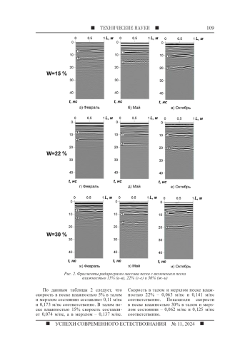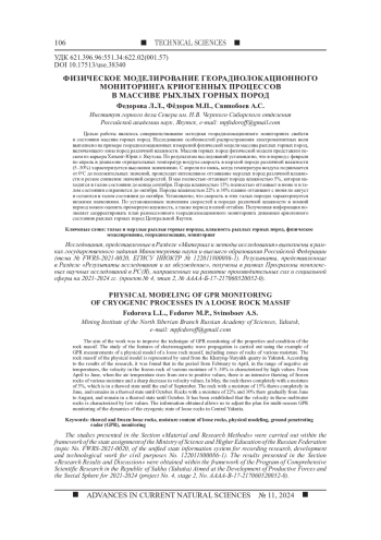 Целью работы являлось совершенствование методики георадиолокационного мониторинга свойств и состояния массива горных пород. Исследование особенностей распространения электромагнитных волн выполнено на примере георадиолокационных измерений физической модели массива рыхлых горных пород, включающего зоны пород различной влажности. Массив горных пород физической модели представлен песком из карьера Хатынг-Юрях г. Якутска. По результатам исследований установлено, что в период с февраля по апрель в диапазоне отрицательных температур воздуха скорость в мерзлой породе различной влажности (5-30%) характеризуется высокими значениями. С апреля по июнь, когда температура воздуха поднимается от 0оС до положительных значений, происходят интенсивное оттаивание мерзлых пород различной влажности и резкое снижение значений скоростей. В мае полностью оттаивает порода влажностью 5%, которая находится в талом состоянии до конца сентября. Порода влажностью 15% полностью оттаивает в июне и в талом состоянии сохраняется до октября. Породы влажностью 22% и 30% плавно оттаивают с июня по август и остаются в талом состоянии до октября. Установлено, что скорость в этих талых породах характеризуется низкими значениями. По установленным значениям скоростей в породах различной влажности в зимний период можно оценить примерную влажность, а также период полной оттайки. Полученная информация позволяет скорректировать план разносезонного георадиолокационного мониторинга динамики криогенного состояния рыхлых горных пород Центральной Якутии.