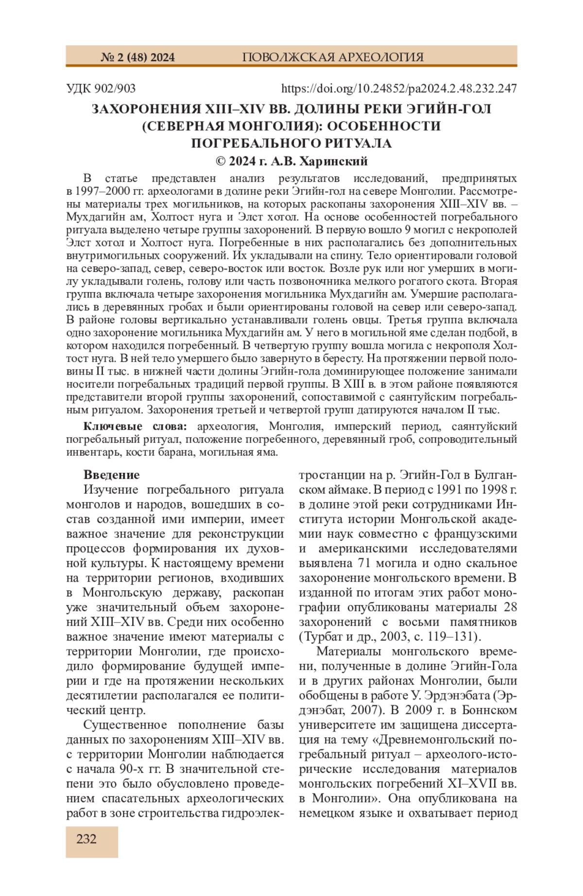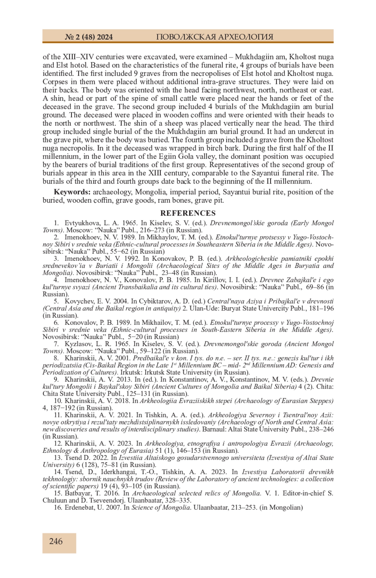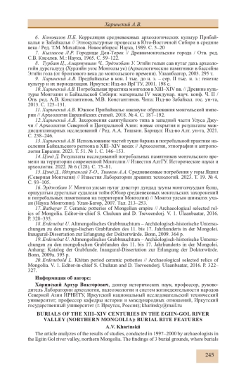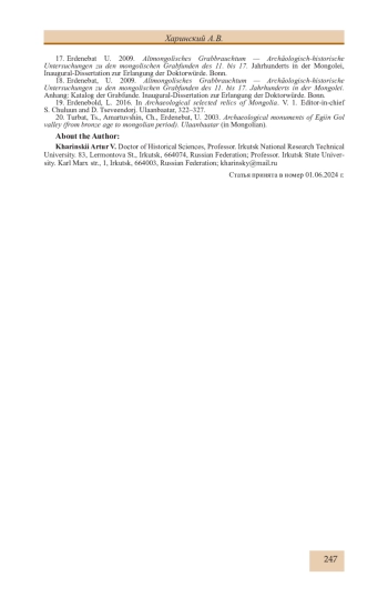 12. Харинский А.В. Захоронения саянтуйского типа в западной части Улуса Джучи // Археология Северной и Центральной Азии: новые открытия и результаты междисциплинарных исследований / Ред. А.А. Тишкин. Барнаул: Изд-во Алт. ун-та, 2021. С. 238-246. EDN: OCEKRL