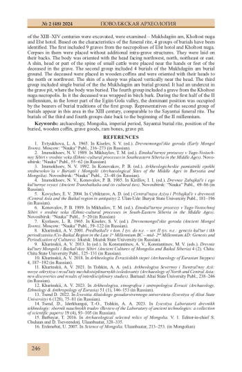 14. Цэнд Д. Результаты исследований погребальных памятников монгольского времени на территории современной Монголии // Известия АлтГУ. Исторические науки и археология. 2022. № 6 (128). С. 75-81.