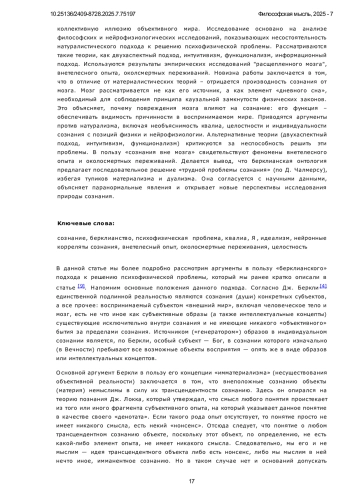 Ключевые фразы: сознание, берклианство, ПСИХОФИЗИЧЕСКАЯ ПРОБЛЕМА, КВАЛИА, Я, идеализм, нейронные корреляты сознания, внетелесный опыт, околосмертные переживания, целостность
