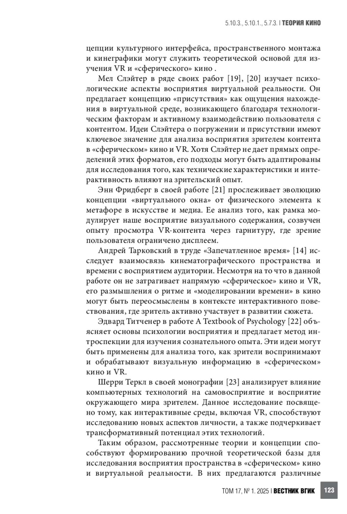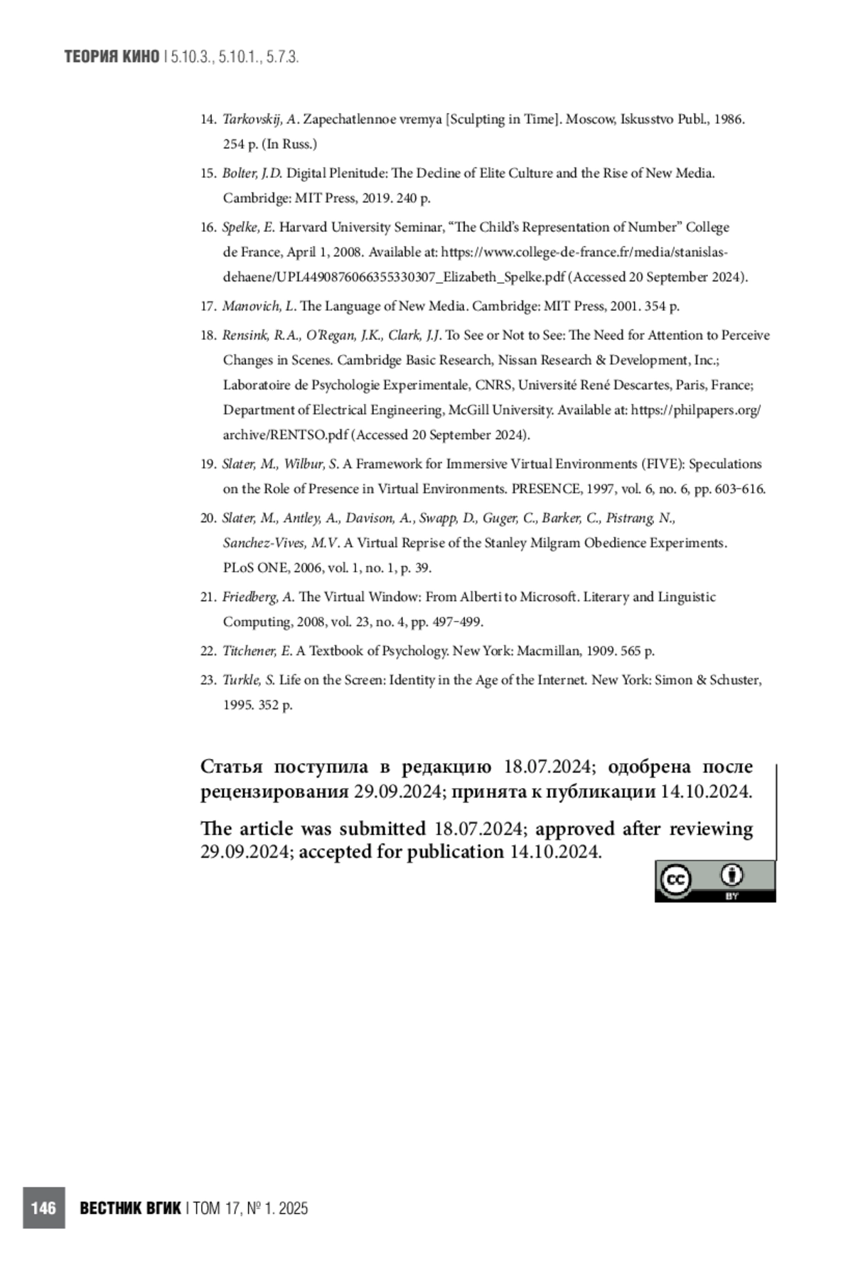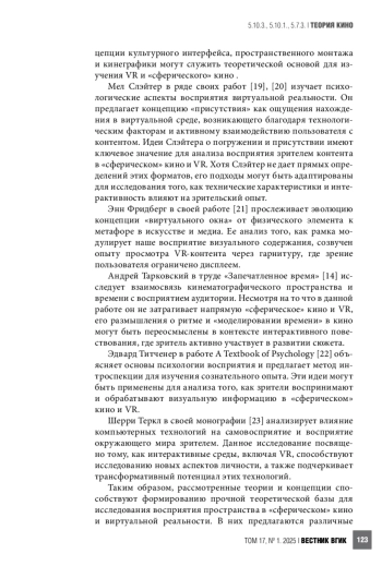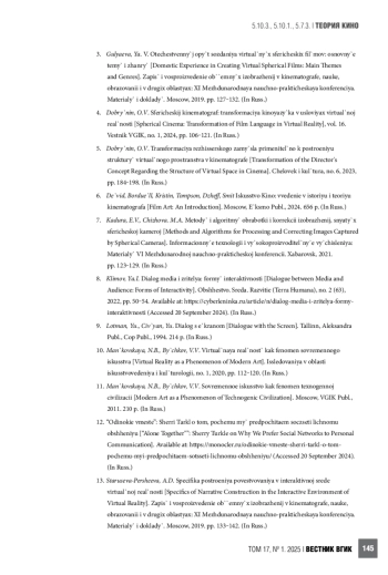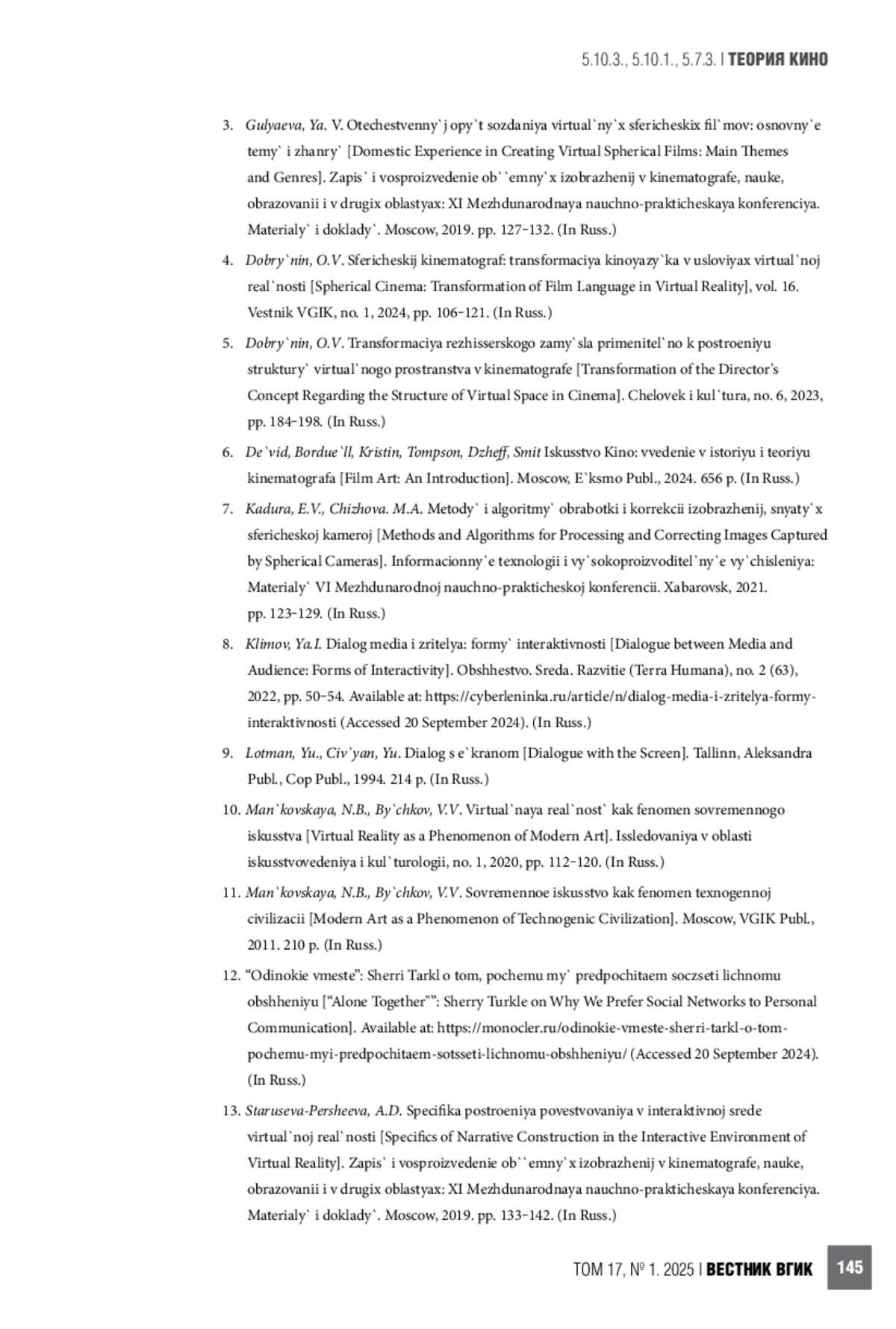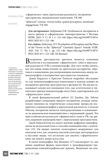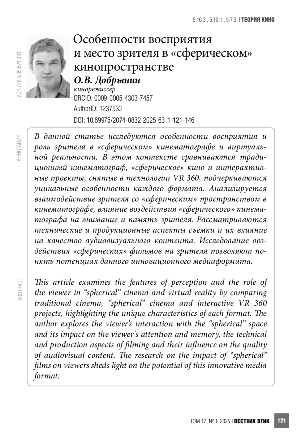 4. Добрынин О.В. Сферический кинематограф: трансформация киноязыка в условиях виртуальной реальности // Вестник ВГИК. Т. 16, № 1. 2024. С. 106-121.