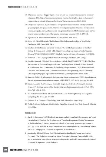 10. Маньковская Н.Б., Бычков В.В. Виртуальная реальность как феномен современного искусства // Исследования в области искусствоведения и культурологии. 2020. № 1. С. 112‒120.