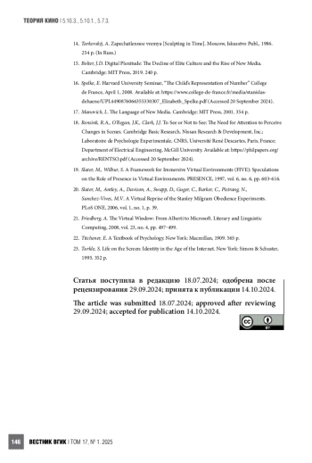 19. Slater, M., Wilbur, S. A Framework for immersive virtual environments (FIVE): Speculations on the role of presence in virtual environments // PRESENCE. 1997. Vol. 6. No 6. pp. 603‒616.