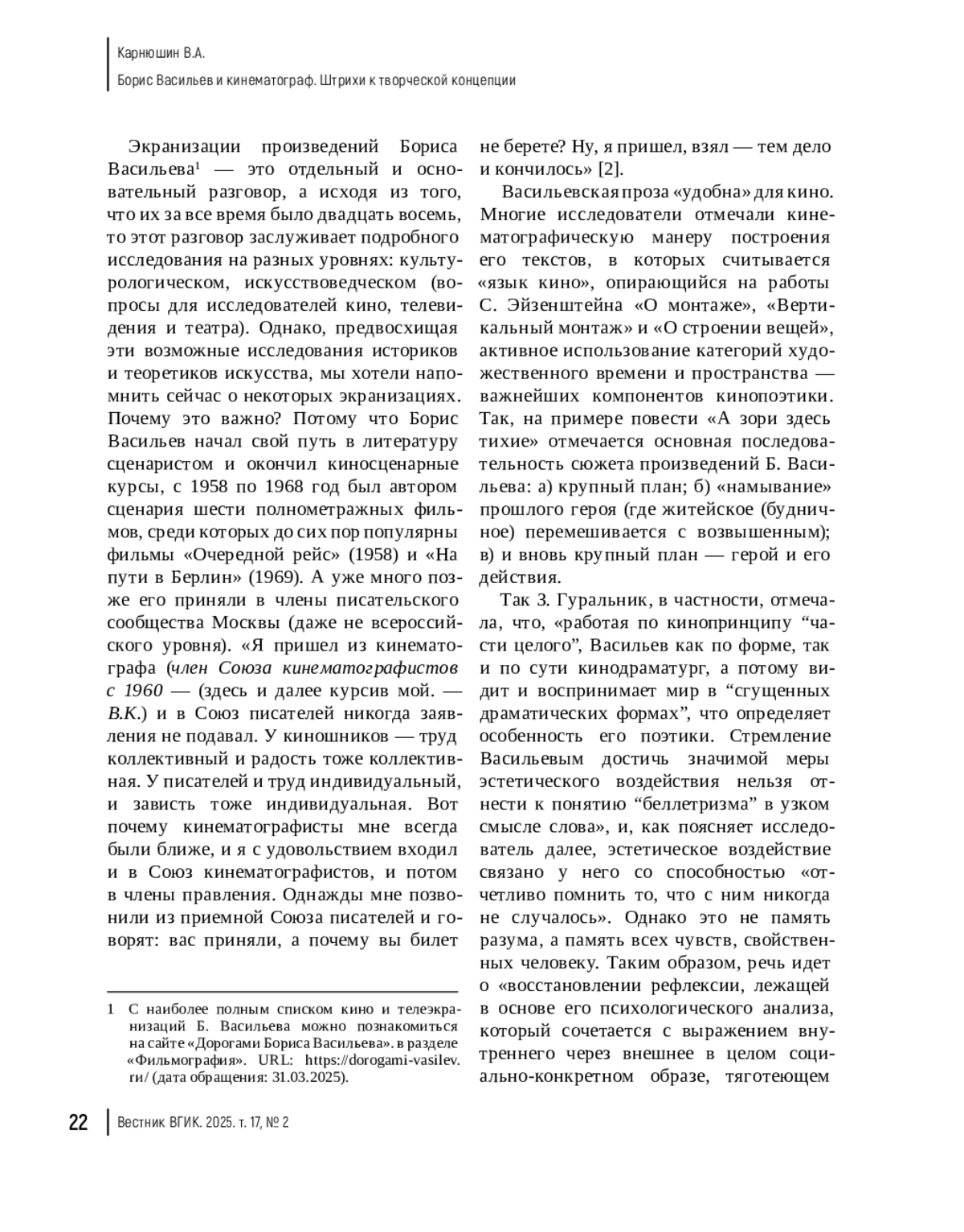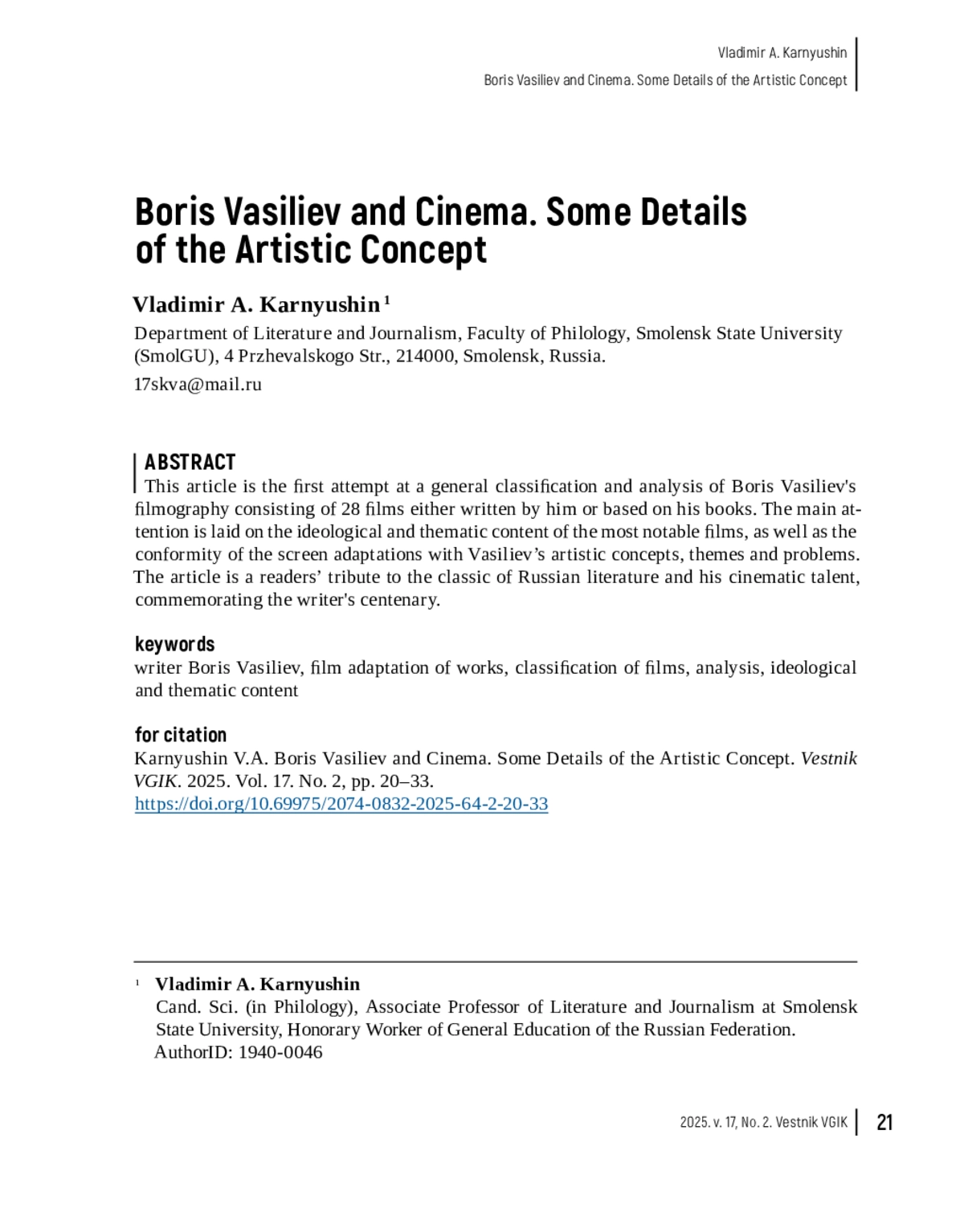 В статье впервые предпринята попытка общей классификации и анализа фильмографии Бориса Васильева, состоящей из 28 фильмов, которые были сняты либо по его сценариям, либо по его литературным произведениям. Анализу подвергнуты наиболее значимые (заметные) киноработы. Особое внимание заострено на их идейно-тематическом содержании, а также на соответствии экранизации творческой концепции автора, его видению темы и проблемы произведения. Статья — дань уважения читательского круга классику отечественной литературы, его кинодраматургическому таланту. Посвящена 100-летию со дня рождения писателя.