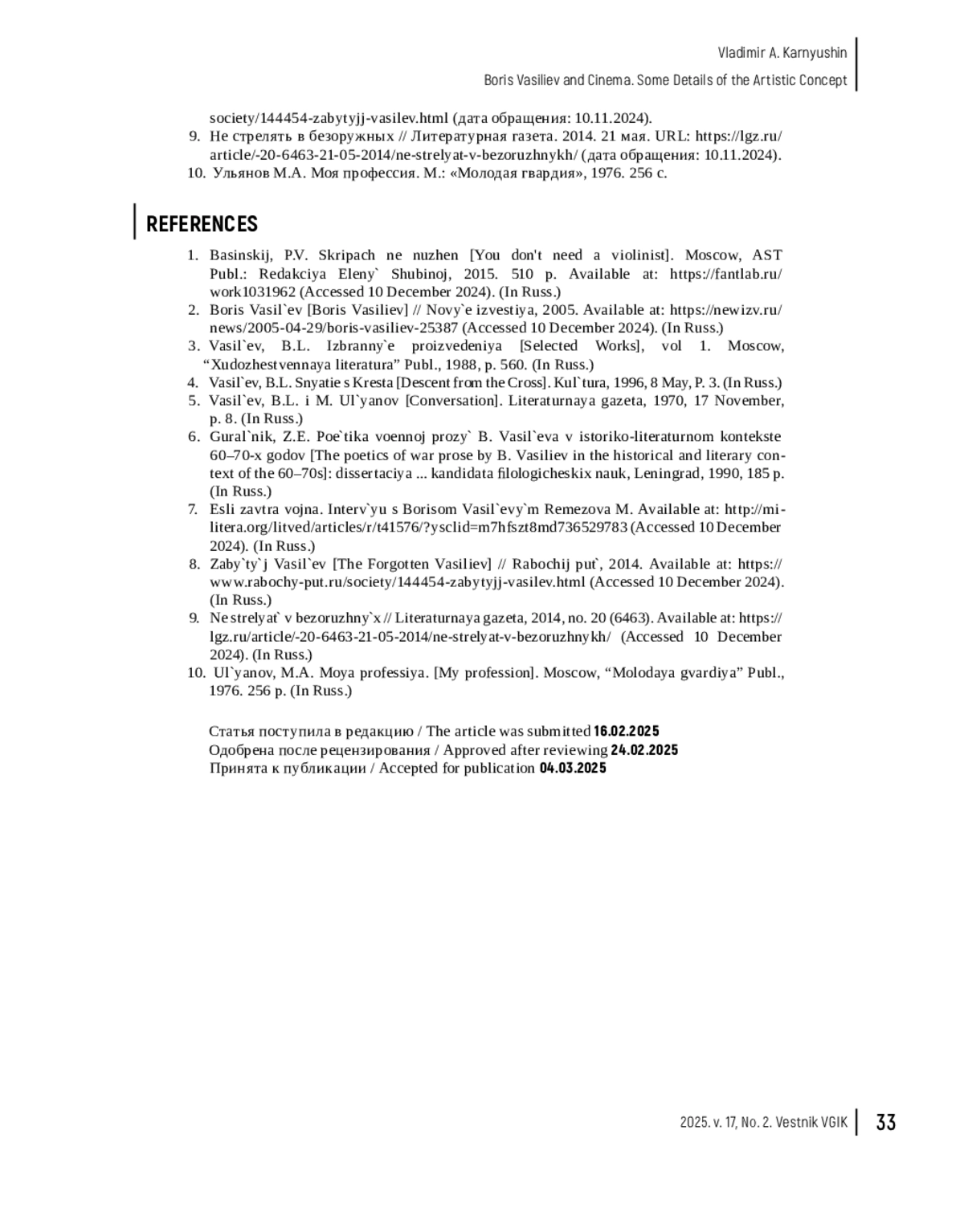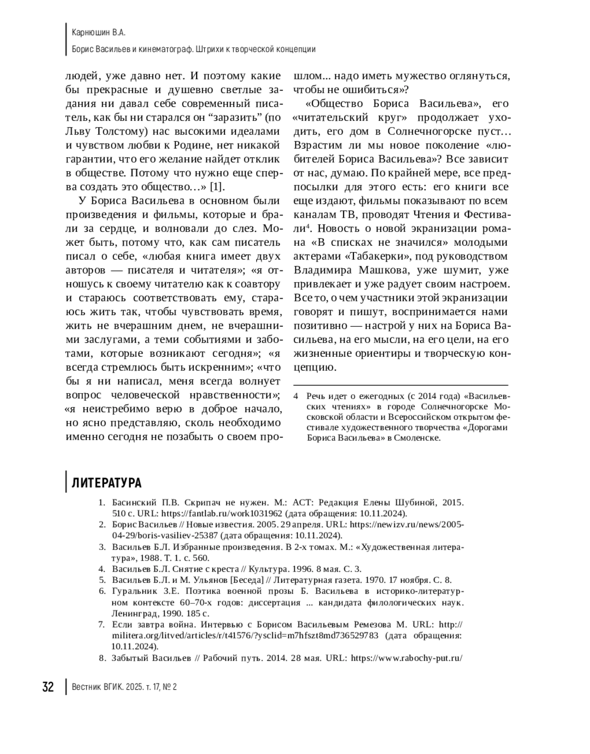 6. Гуральник З.Е. Поэтика военной прозы Б. Васильева в историко-литературном контексте 60‒70-х годов: диссертация ... кандидата филологических наук. Ленинград, 1990. 185 с.