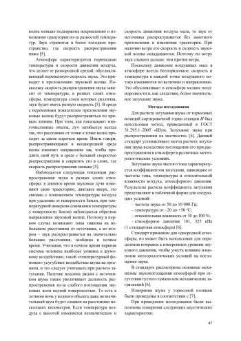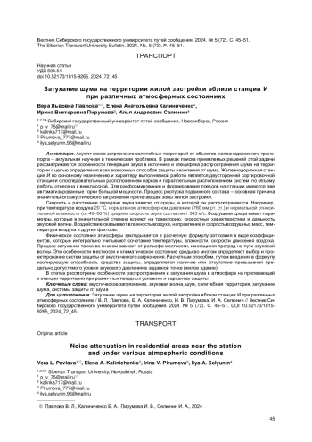 В статье рассмотрены особенности распространения и затухания шума в атмосфере на прилегающей к станции территории при различных погодных условиях и вариантах защиты.