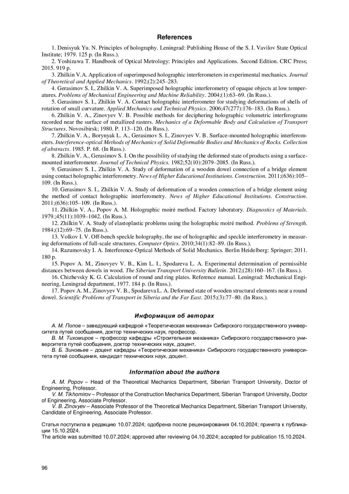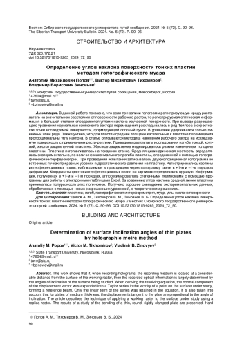 ПОПОВ А. М., ТИХОМИРОВ В. М., ЗИНОВЬЕВ В. Б. ОПРЕДЕЛЕНИЕ УГЛОВ НАКЛОНА ПОВЕРХНОСТИ ТОНКИХ ПЛАСТИН МЕТОДОМ ГОЛОГРАФИЧЕСКОГО МУАРА // ВЕСТНИК СИБИРСКОГО ГОСУДАРСТВЕННОГО УНИВЕРСИТЕТА ПУТЕЙ СООБЩЕНИЯ. 2024. № 5 (72)