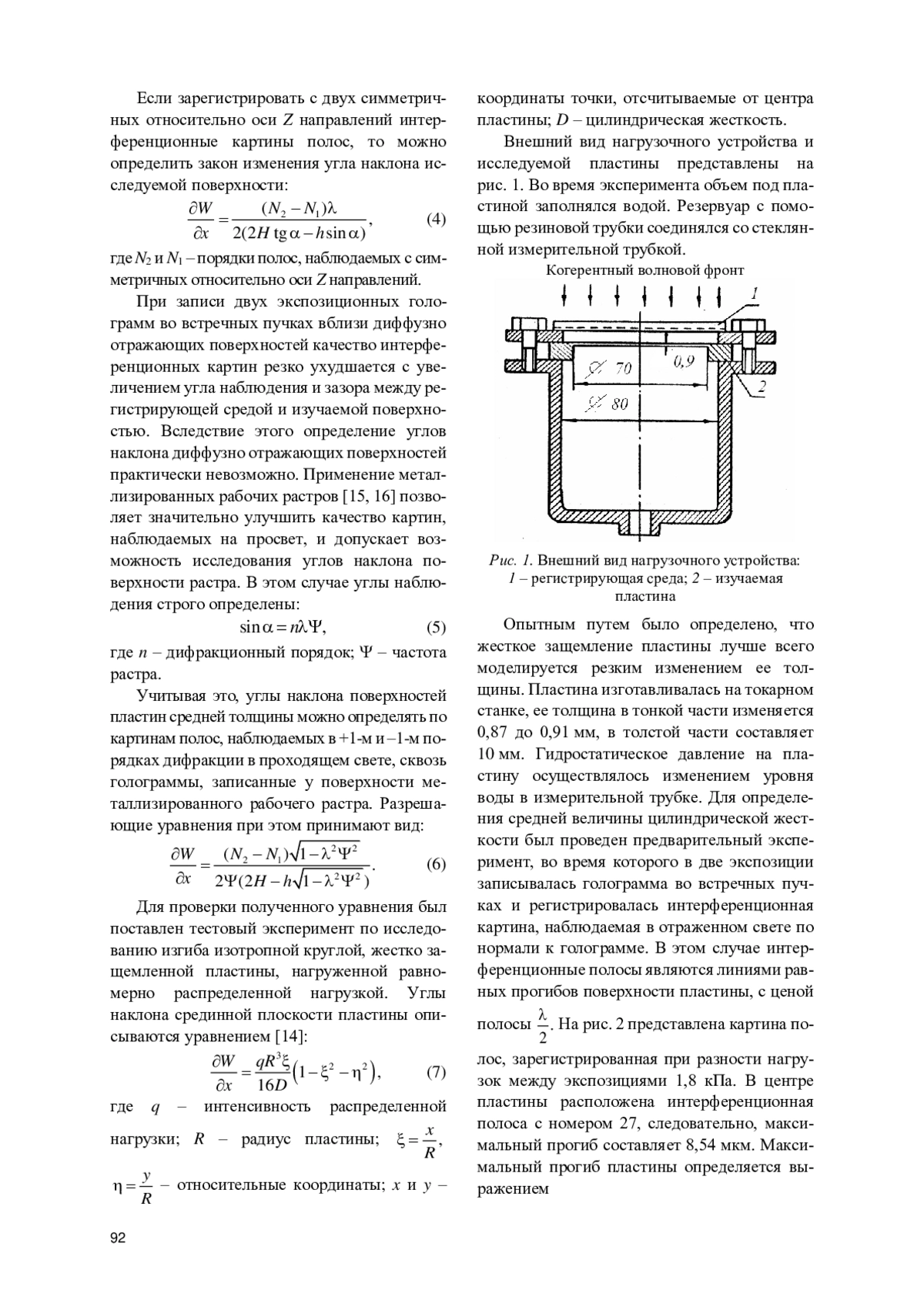 В данной работе показано, что если при записи голограмм регистрирующую среду располагать на значительном расстоянии от поверхности рабочего растра, то регистрируемая оптическая информация в большей степени определяется углами наклона изучаемой поверхности. При выводе разрешающего уравнения нормальная компонента вектора перемещения раскладывалась в ряд Тейлора в окрестности точки исследуемой поверхности, формирующей опорный пучок. В уравнении удерживался только линейный член ряда. Также учтено, что для пластин средней толщины касательные к пластине перемещения пропорциональны углу наклона. В статье описывается методика нанесения рабочего растра на исследуемую поверхность с применением растр-реплики. Приведены результаты исследования изгиба тонкой, круглой, жестко защемленной пластины. Жесткое защемление моделировалось резким изменением толщины пластины. Пластина изготавливалась на токарном станке. Средняя цилиндрическая жесткость определялась экспериментально, по величине максимального прогиба пластины, определенной с помощью голографической интерферометрии. При проведении испытаний записывалась двухэкспозиционная голограмма во встречных пучках при разных уровнях гидростатического давления на пластину. Регистрировались картины интерференционных полос, наблюдаемые в проходящем через голограмму свете в +1-м и –1-м порядках дифракции. Координаты центра интерференционных полос на картинах определялись вручную. Информация, полученная в +1-м и –1-м порядках, аппроксимировалась степенными полиномами с помощью программы для работы с электронными таблицами Excel. За уравнение углов наклона средней линии пластины принималась полуразность этих полиномов. Получено хорошее совпадение экспериментальных данных, обработанных с помощью новых разрешающих уравнений, с теоретическим решением.