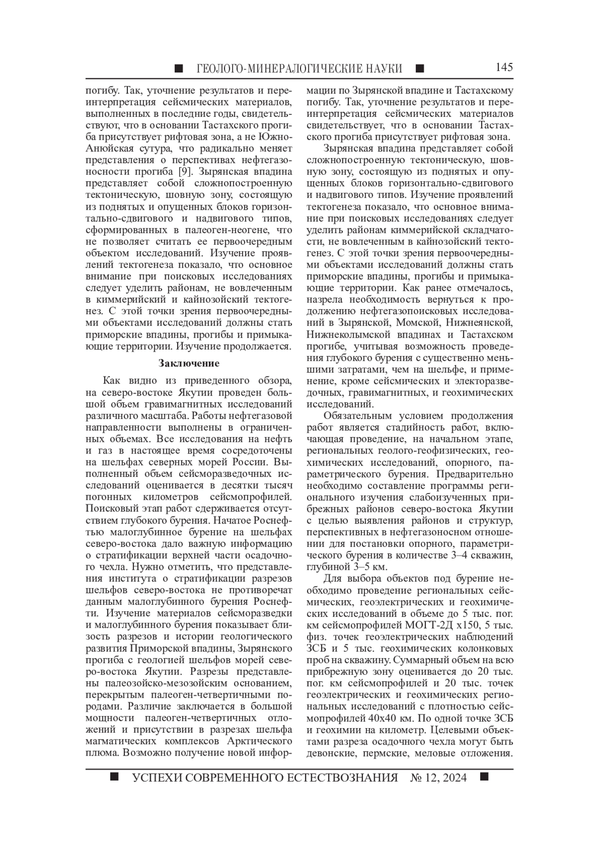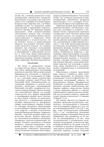 Целью данной работы является разработка предложений для рационального размещения работ на нефть и газ в слабоизученных прибрежных районах северо-востока Республики Саха (Якутия) с учетом новых данных по геологии региона. Выполненная работа направлена на уточнение, детализацию и повышение достоверности дальнейших исследований, предварительно актуализированных в процессе научного изучения материалов геологоразведочных работ прошлых лет. По электроразведочным исследованиям на Приморской площади была выделена аномальная зона продольной проводимости, подтверждено существование кайнозойских структур: Нижнеянского грабена и Усть-Янского поднятия. Намечена положительная Селенняхская структура, перспективная в нефтегазоносном отношении. По аэромагнитной съемке Тастахской впадины и Хромского массива установлено блоковое строение фундамента и показаны перспективы впадин в нефтегазоносном отношении. Переинтерпретация сейсмических материалов, выполненная в последние годы, показала, что в основании Тастахского прогиба присутствует рифтовая зона. Зырянская впадина представляет собой сложнопостроенную тектоническую, шовную зону, состоящую из поднятых и опущенных блоков горизонтально-сдвигового и надвигового типов. Эти и другие данные дают основание о возобновлении нефтегазопоисковых исследований в Зырянской, Момской, Нижнеянской, Нижнеколымской впадинах и Тастахском прогибе. Обязательным условием продолжения работ является стадийность работ, включающая проведение, на начальном этапе, научных, региональных геолого-геофизических, геохимических исследований, опорного, параметрического бурения.