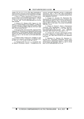 8. 	Ovcharova N.V., Silantyeva M.M., Vaganov A.V., Masanina A.A. Invasion dynamics of Acer negundo L. in ribbon forests of the Altai Krai: ecological impacts and predictive habitat modeling // Acta Biologica Sibirica. 2024. No. 10. P. 1673-1688. DOI: 10.5281/zenodo.14437657.