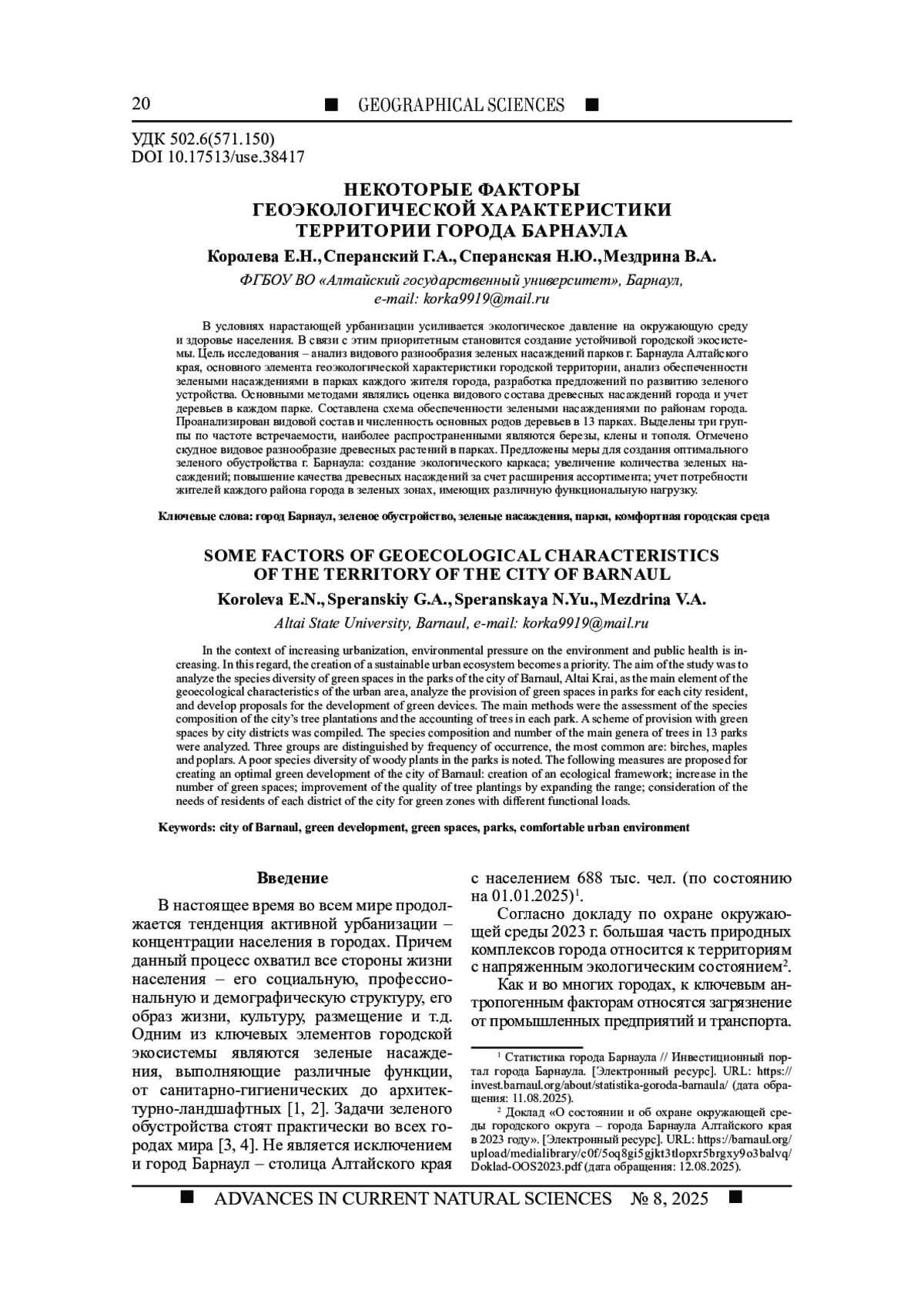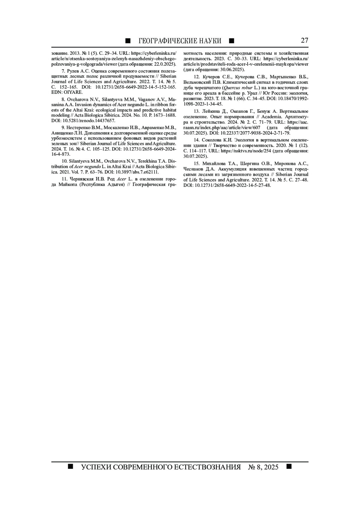 9. 	Нестеренко В.М., Москаленко И.В., Авраменко М.В., Анищенко Л.Н. Дополнения к долговременной оценке среды урбоэкосистем с использованием фоновых видов растений зеленых зон// Siberian Journal of Life Sciences and Agriculture. 2024. Т. 16. № 4. С. 105-125. DOI: 10.12731/2658-6649-2024-16-4-873.