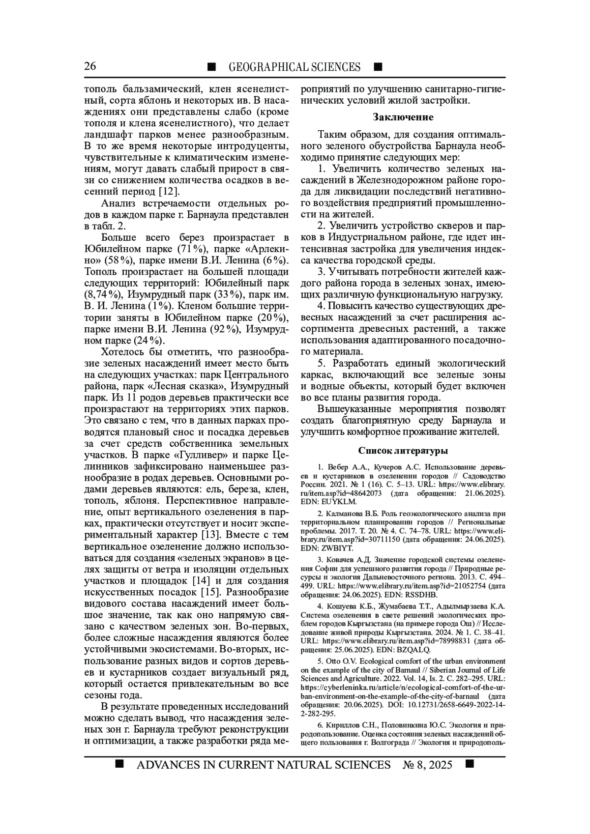 5. 	Otto O.V. Ecological comfort of the urban environment on the example of the city of Barnaul // Siberian Journal of Life Sciences and Agriculture. 2022. Vol. 14, Is. 2. С. 282-295. URL: https://cyberleninka.ru/article/n/ecological-comfort-of-the-urban-environment-on-the-example-of-the-city-of-barnaul (дата обращения: 20.06.2025). DOI: 10.12731/2658-6649-2022-14-2-282-295.