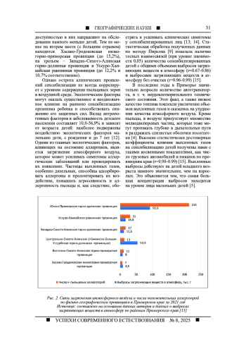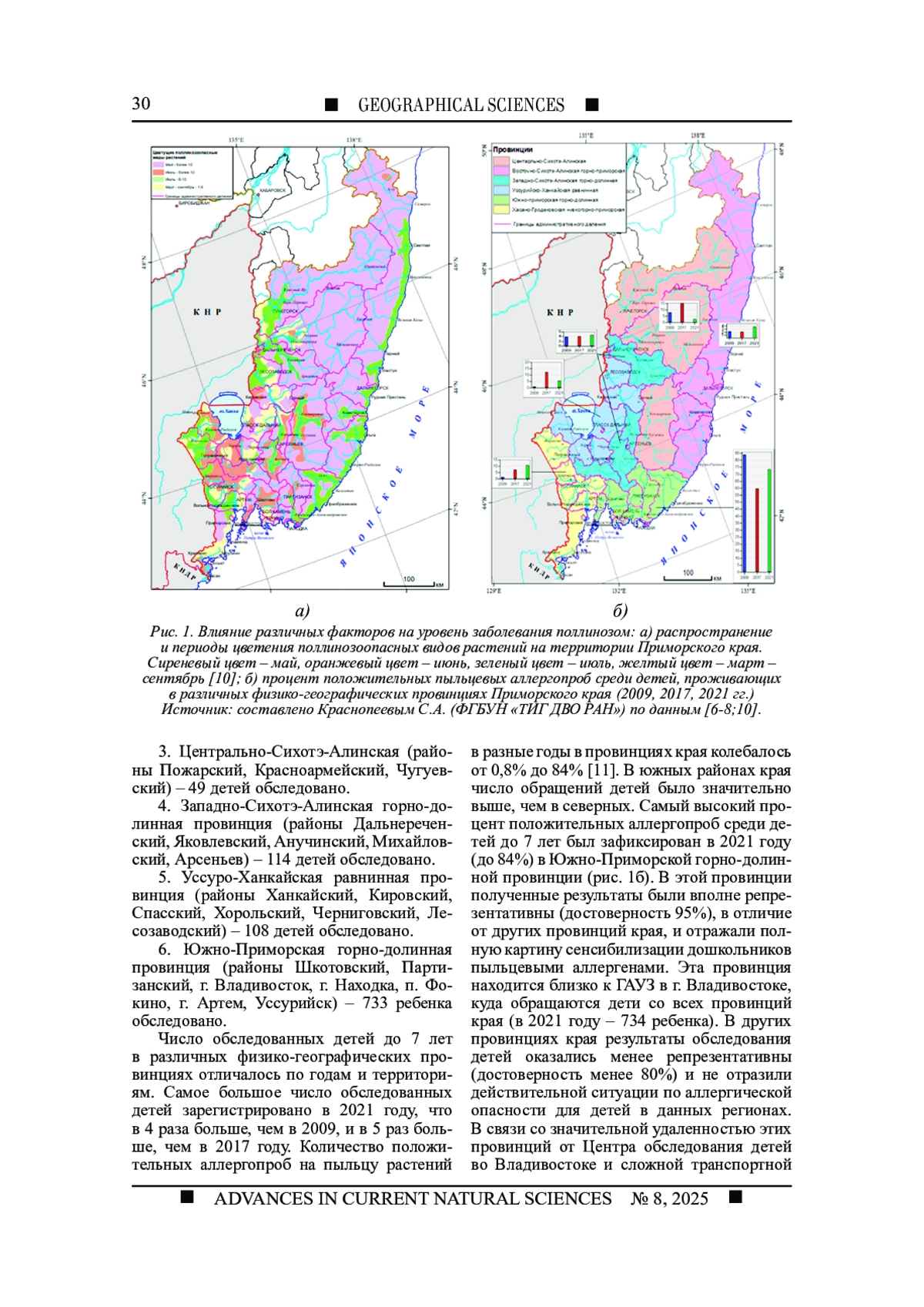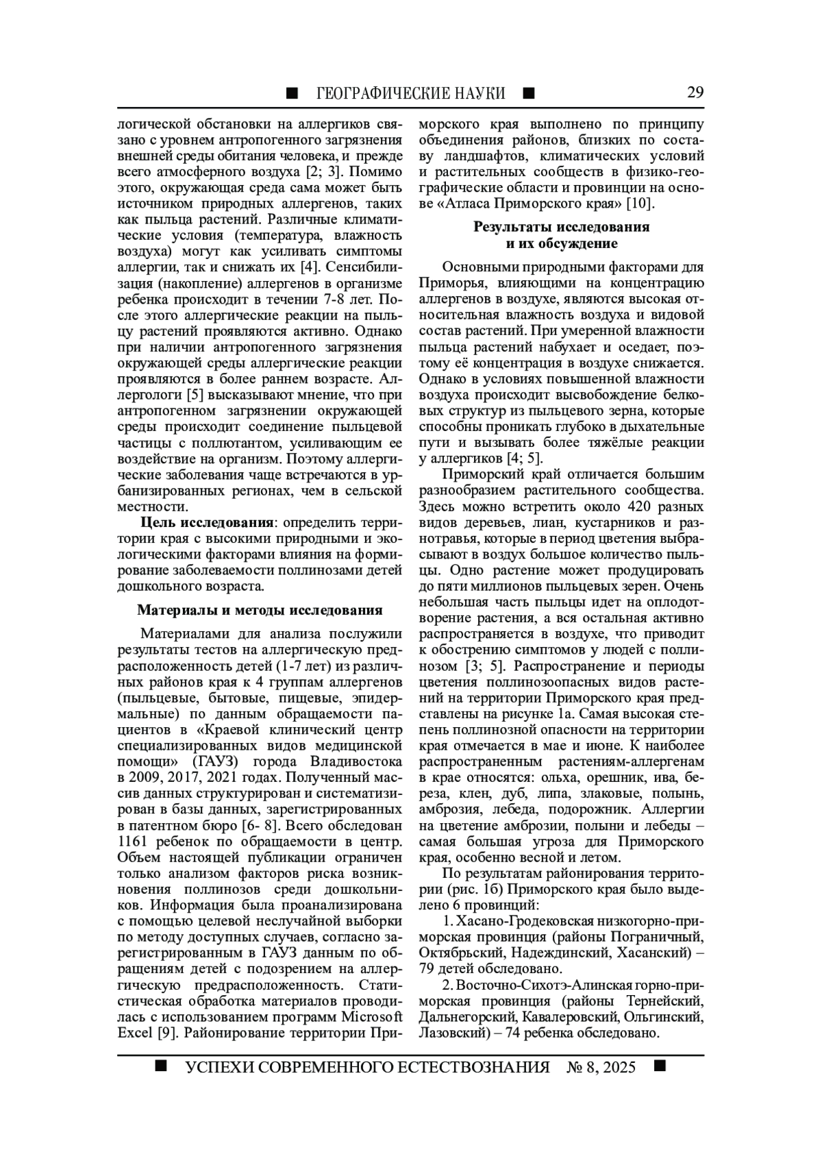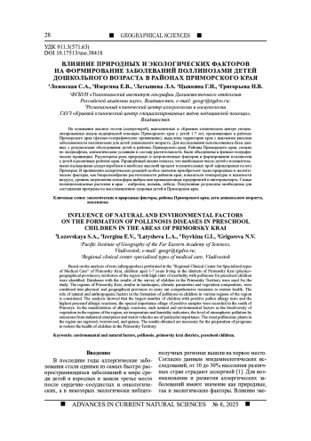 На основании анализа тестов (аллергопроб), выполненных в «Краевом клиническом центре специализированных видов медицинской помощи» Приморского края у детей 1-7 лет, проживающих в районах Приморского края (физико-географических провинциях), выделены территории края с высокими рисками заболеваемости поллинозами для детей дошкольного возраста. Для исследования использовались базы данных с результатами обследования детей в районах Приморского края. Районы Приморского края, схожие по ландшафтам, климатическим условиям и составу растительности, были объединены в физико-географические провинции. Рассмотрена роль природных и антропогенных факторов в формировании поллинозов у детей в различных районах края. Проведённый анализ показал, что наибольшее число детей с положительными пыльцевыми аллергопробами и наиболее высокий процент положительных проб зафиксирован на юге Приморья. В проявлении аллергических реакций особое значение приобретают такие природные и экологические факторы, как биоразнообразие растительности районов края, показатели температуры и влажности воздуха, уровень загрязнения атмосферы выбросами промышленных предприятий и автотранспорта. Самые поллинозоопасные растения в крае - амброзия, полынь, лебеда. Полученные результаты необходимы для составления программ по восстановлению здоровья детей в Приморском крае.