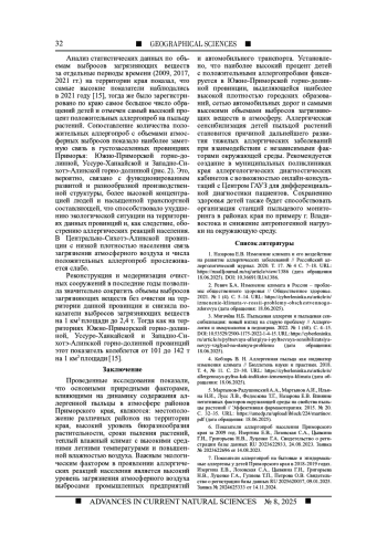 11. Изергина Е.В., Лозовская С.А. Аллергии у детей в различных районах Приморского края // Геосистемы Северо-Восточной Азии: природные и социально-экономические факторы и структуры: сборник научных статей. Владивосток, 2024. С. 291-293. DOI: 10.35735/9785604968338_291. ISBN 978-5-6049683-3-8.