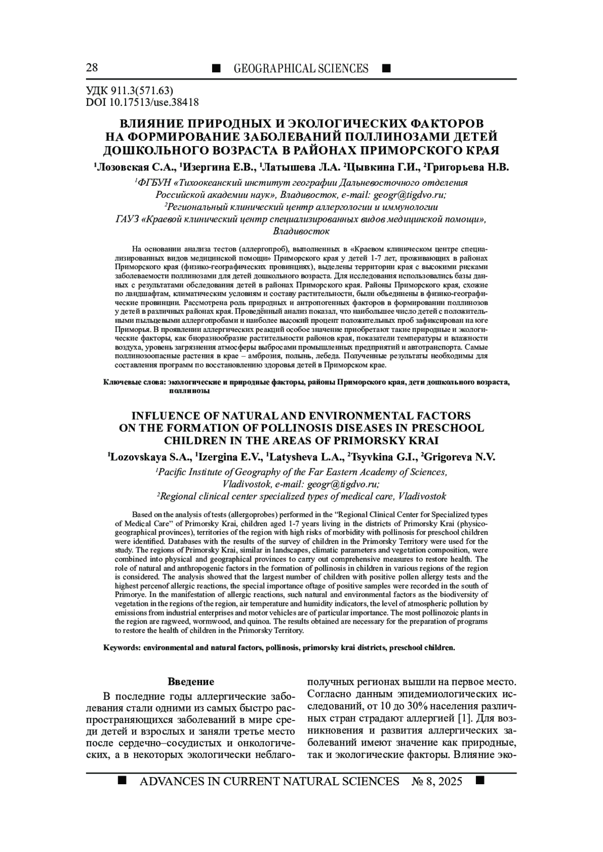 11. 	Изергина Е.В., Лозовская С.А. Аллергии у детей в различных районах Приморского края // Геосистемы Северо-Восточной Азии: природные и социально-экономические факторы и структуры: сборник научных статей. Владивосток, 2024. С. 291-293. DOI: 10.35735/9785604968338_291. ISBN 978-5-6049683-3-8.