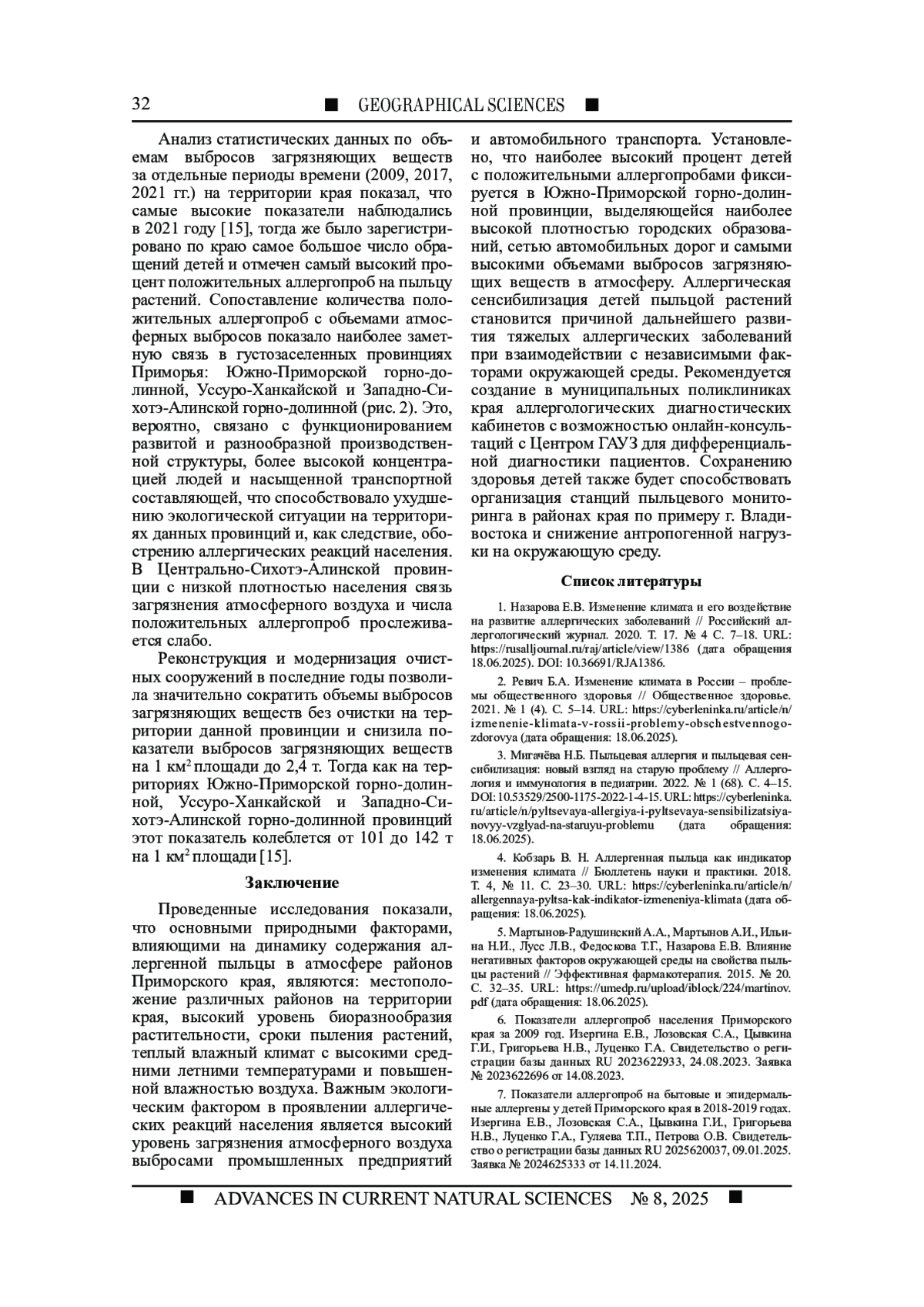 1. 	Назарова Е.В. Изменение климата и его воздействие на развитие аллергических заболеваний // Российский аллергологический журнал. 2020. Т. 17. № 4 С. 7-18. URL: https://rusalljournal.ru/raj/article/view/1386 (дата обращения 18.06.2025). DOI: 10.36691/RJA1386. 2. 	Ревич Б.А. Изменение климата в России - проблемы общественного здоровья // Общественное здоровье. 2021. № 1 (4). С. 5-14. URL: https://cyberleninka.ru/article/n/izmenenie-klimata-v-rossii-problemy-obschestvennogo-zdorovya (дата обращения: 18.06.2025).