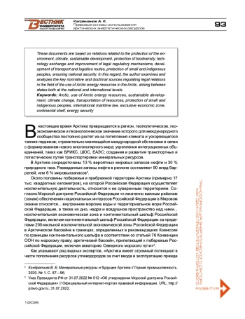 Вопросы использования арктических минеральных ресурсов представляют интерес как для арктических государств, так и для государств, не имеющих прямого выхода к арктическому региону, но заинтересованных в силу стратегических обстоятельств в осуществлении деятельности в арктическом регионе. В последнее время целый ряд государств приняли либо обновили свою арктическую стратегию в связи с бурно меняющейся международной повесткой и в целях адаптации существующих документов к геополитическим реалиям. В основе этих документов лежат отношения, связанные с защитой окружающей среды, климата, устойчивого развития, с защитой биоразнообразия, обменом технологиями и совершенствованием правовых регуляторных механизмов, с развитием транспортно-логистических путей, защитой малочисленных и коренных народов, обеспечением национальной безопасности. В этой связи автором рассмотрены и проанализированы ключевые нормативные и доктринальные источники, регулирующие правоотношения в сфере использования арктических энергетических ресурсов, возникающие между государствами как на национальном, так и на международном уровне.