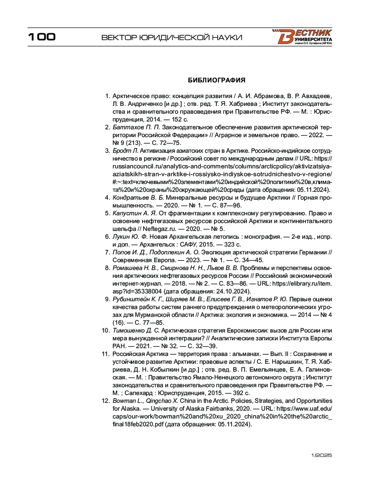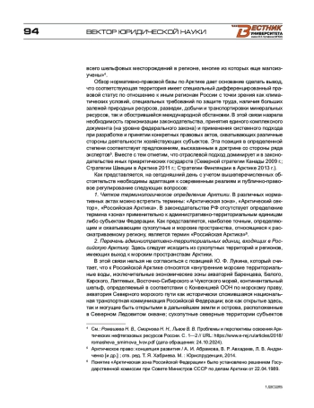 1. Арктическое право: концепция развития / А. И. Абрамова, В. Р. Авхадеев, Л. В. Андриченко [и др.] ; отв. ред. Т. Я. Хабриева ; Институт законодательства и сравнительного правоведения при Правительстве РФ. - М. : Юриспруденция, 2014. - 152 с.