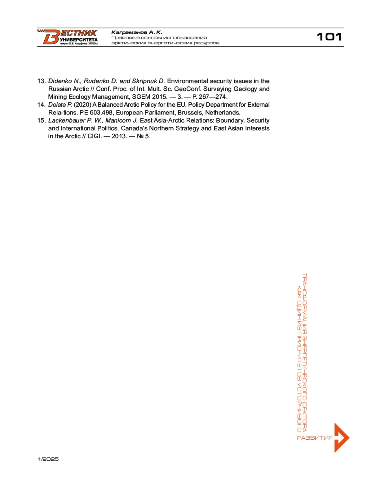 13. Didenko N., Rudenko D. and Skripnuk D. Environmental security issues in the Russian Arctic // Conf. Proc. of Int. Mult. Sc. GeoConf. Surveying Geology and Mining Ecology Management, SGEM 2015. - 3. - Р. 267-274.