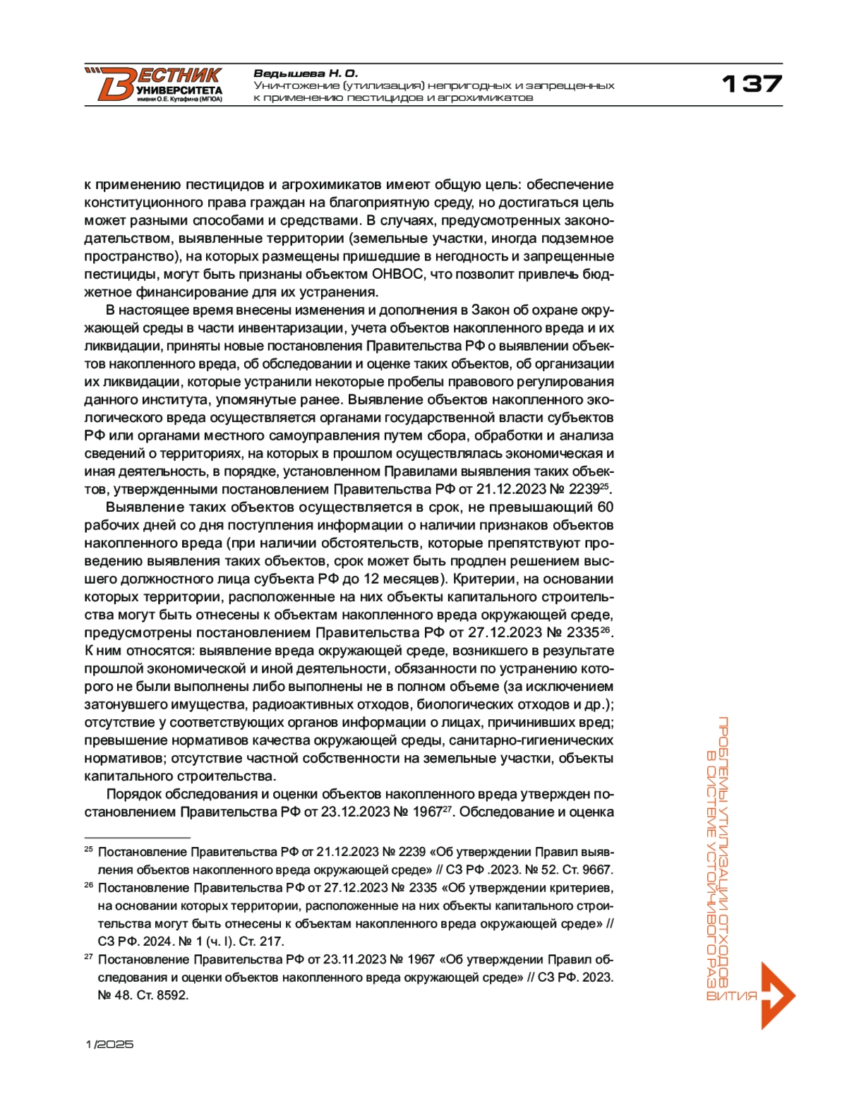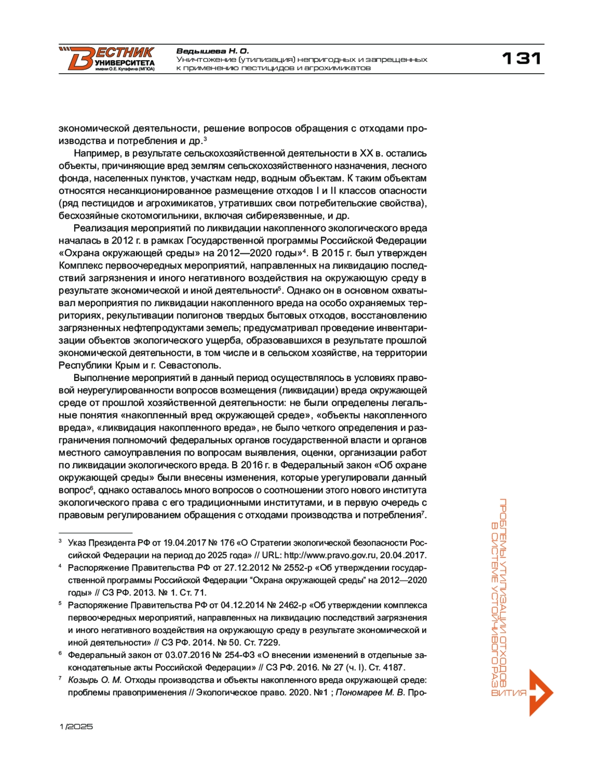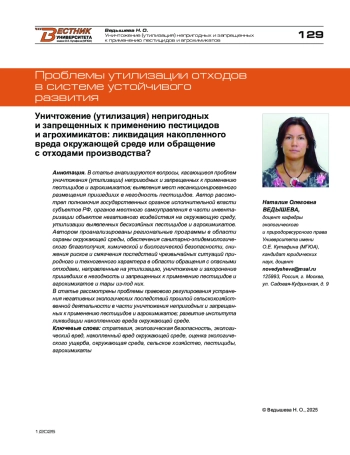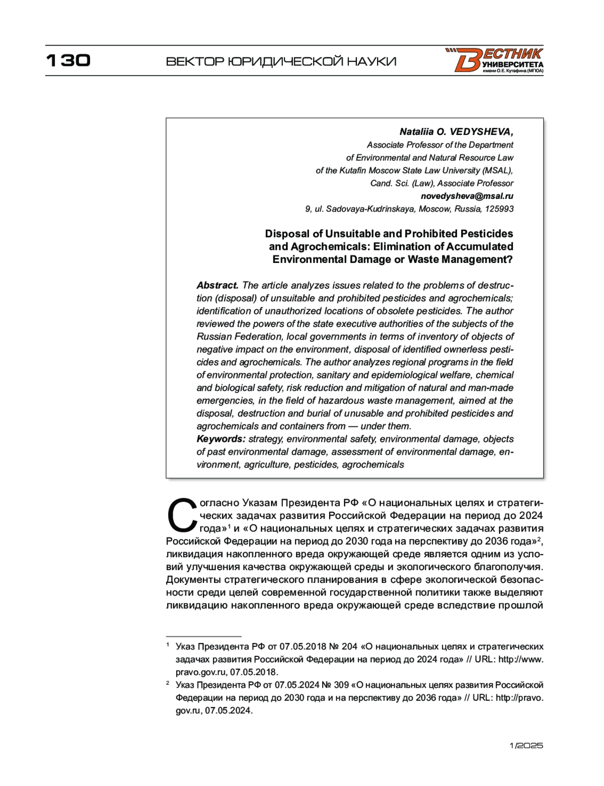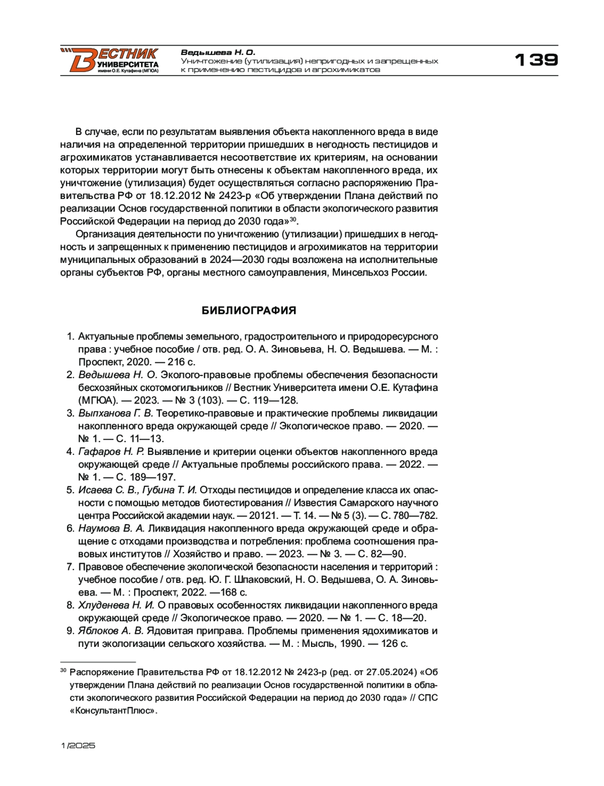 2. Ведышева Н. О. Эколого-правовые проблемы обеспечения безопасности бесхозяйных скотомогильников // Вестник Университета имени О.Е. Кутафина (МГЮА). - 2023. - № 3 (103). - С. 119-128.