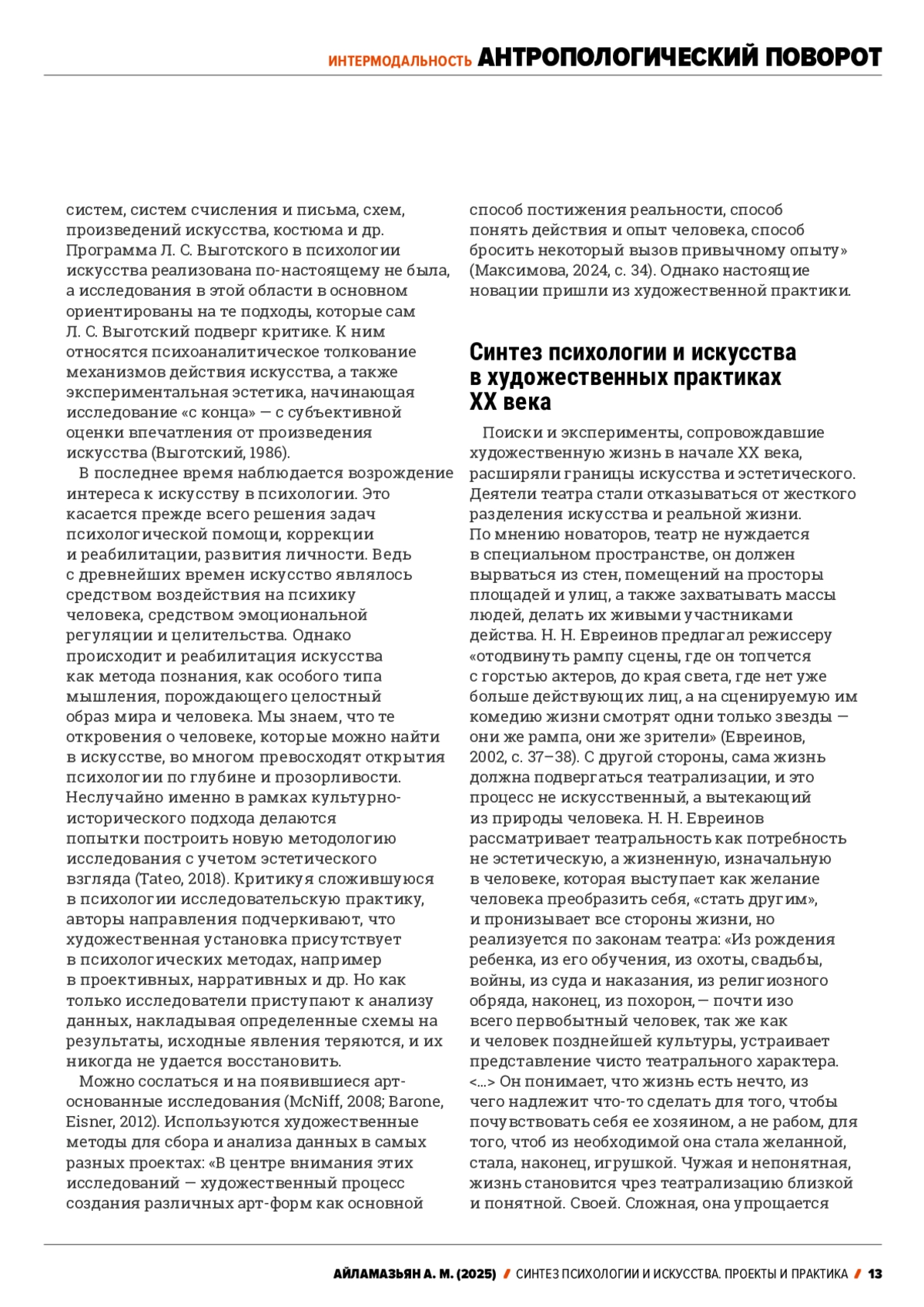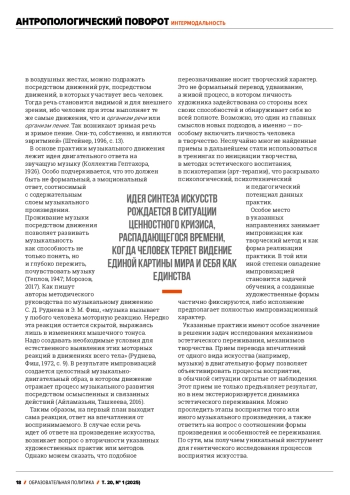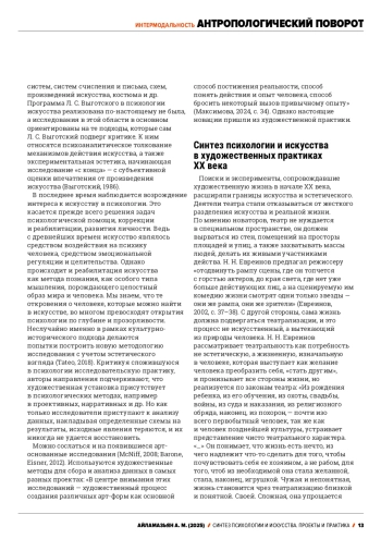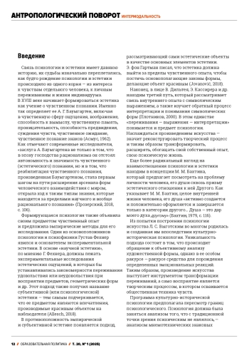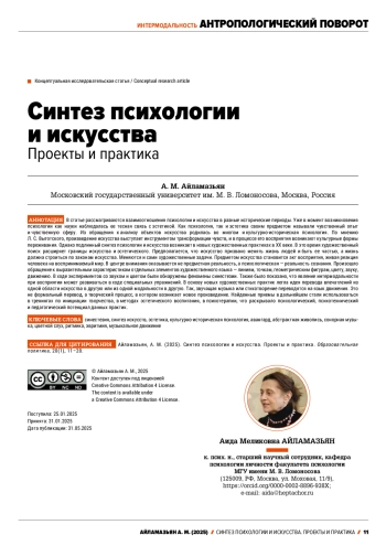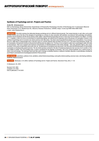 The article examines the relationship between psychology and art in different historical periods. Their mutual attraction to each other can be noted recently, however, even at the time of the emergence of psychology as a science, its close connection with aesthetics was observed. Both psychology and aesthetics pointed to sensory experience and the sensory sphere as their subject. Cultural-historical psychology was born in many ways from the analysis of art objects. According to L. S. Vygotsky, a work of art acts as an instrument for transforming feelings, and cultural forms of experience arise in the process of its perception. However, a true synthesis of psychology and art occurred in new artistic practices in the 20th century. The artistic search expanded the boundaries of art and aesthetics. It was assumed that art is called upon to change people’s lives, to become a part of it, and life should be built according to the laws of art. The artistic tasks themselves change. The act of perception, a living human reaction to the perceived world becomes the subject of art. The focus is not on objective reality, but on psychological reality, the reality of consciousness. There was an appeal to the expressive characteristics of individual elements of the artistic language - lines, dots, geometric figures, color, sound, movement. In the course of experiments with sound, color, etc., the phenomena of synesthesia were discovered. It was also shown that the phenomenon of intermodality in perception can develop during special exercises. The new artistic practices are based on the idea of transferring impressions from one area of art to another or from one modality to another. Thus, the sounding music or poem is translated into the language of movement. This is not a formal translation, but a creative process in which a new work emerges. The techniques found were later used in trainings on initiating creativity, in methods of aesthetic education, in psychotherapy, revealing the psychological, psychotechnical and pedagogical potential of these practices.