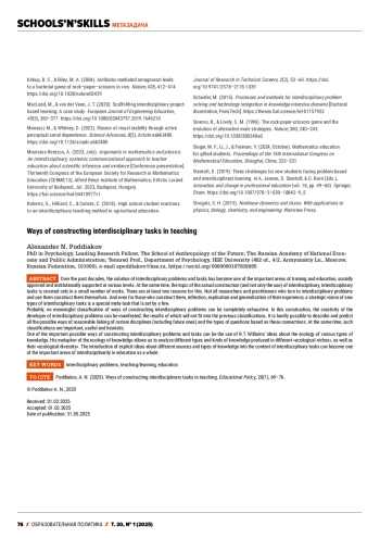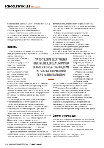 Институционально поддерживаемым. При этом тема собственно конструирования (а не только использования) межпредметных, междисциплинарных задач освещается лишь в небольшом количестве работ. Причин для этого, можно полагать, как минимум две. Далеко не все исследователи и практики, обращающиеся к междисциплинарным задачам и использующие их, сами их конструируют. И даже для тех, кто их конструирует, рефлексия, экспликация и обобщение своего опыта, стратегическое видение новых типов междисциплинарных задач - это особая метазадача, которую ставят единицы. Вероятно, никакая содержательная классификация путей конструирования межпредметных задач не может быть исчерпывающей. В этом конструировании может проявиться креативность разработчика междисциплинарных задач, результаты которой не впишутся в прежние классификации. Вряд ли можно описать и предсказать все возможные пути разумного связывания тех или иных дисциплин (в том числе будущих) и типы вопросов, основанные на этих связях. При этом такие классификации важны, полезны и эвристичны. Одним из важных возможных путей конструирования междисциплинарных проблем и задач может стать использование представлений об экологии различных видов знания Р. Т. Уильямса. Его метафора экологии знания позволяет анализировать разные типы и виды знаний, производимых в разных «экологических нишах», а также их «экологическое разнообразие». Введение в содержание междисциплинарных задач эксплицированных представлений о разных источниках и видах знаний может стать одним из важных направлений междисциплинарности в образовании в целом.
