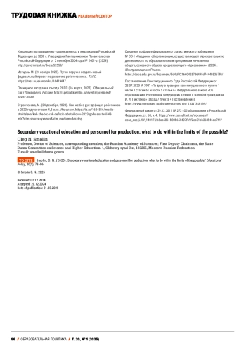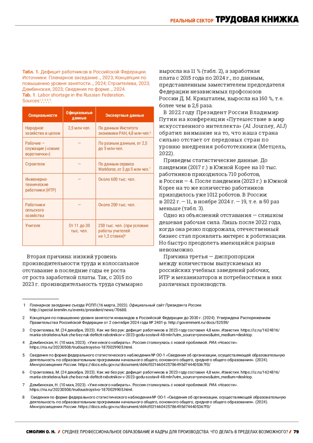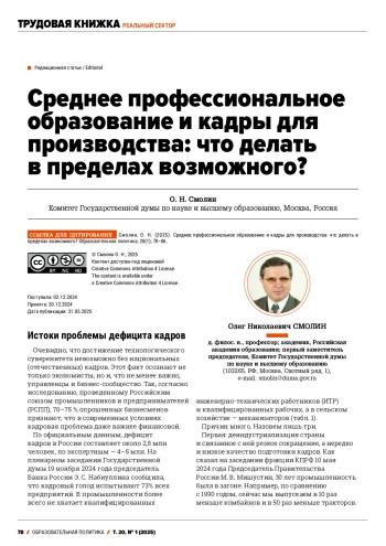 Очевидно, что достижение технологического суверенитета невозможно без национальных (отечественных) кадров. Этот факт осознают не только экономисты, но и, что не менее важно, управленцы и бизнес-сообщество. Так, согласно исследованию, проведенному Российским союзом промышленников и предпринимателей (РСПП), 70–75 % опрошенных бизнесменов признают, что в современных условиях кадровая проблема даже важнее финансовой