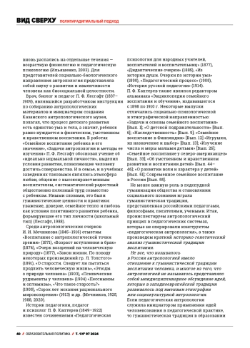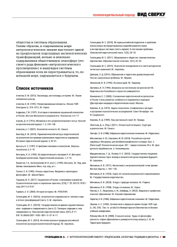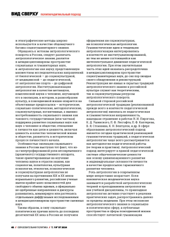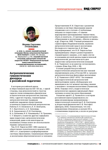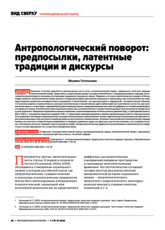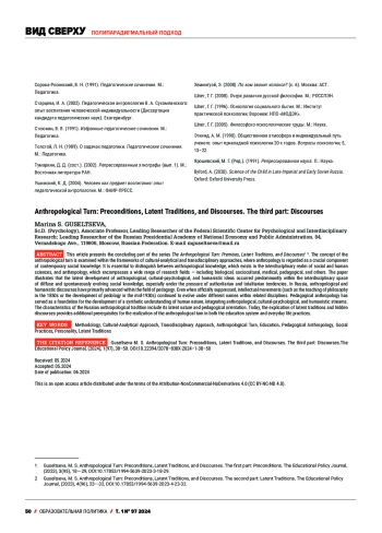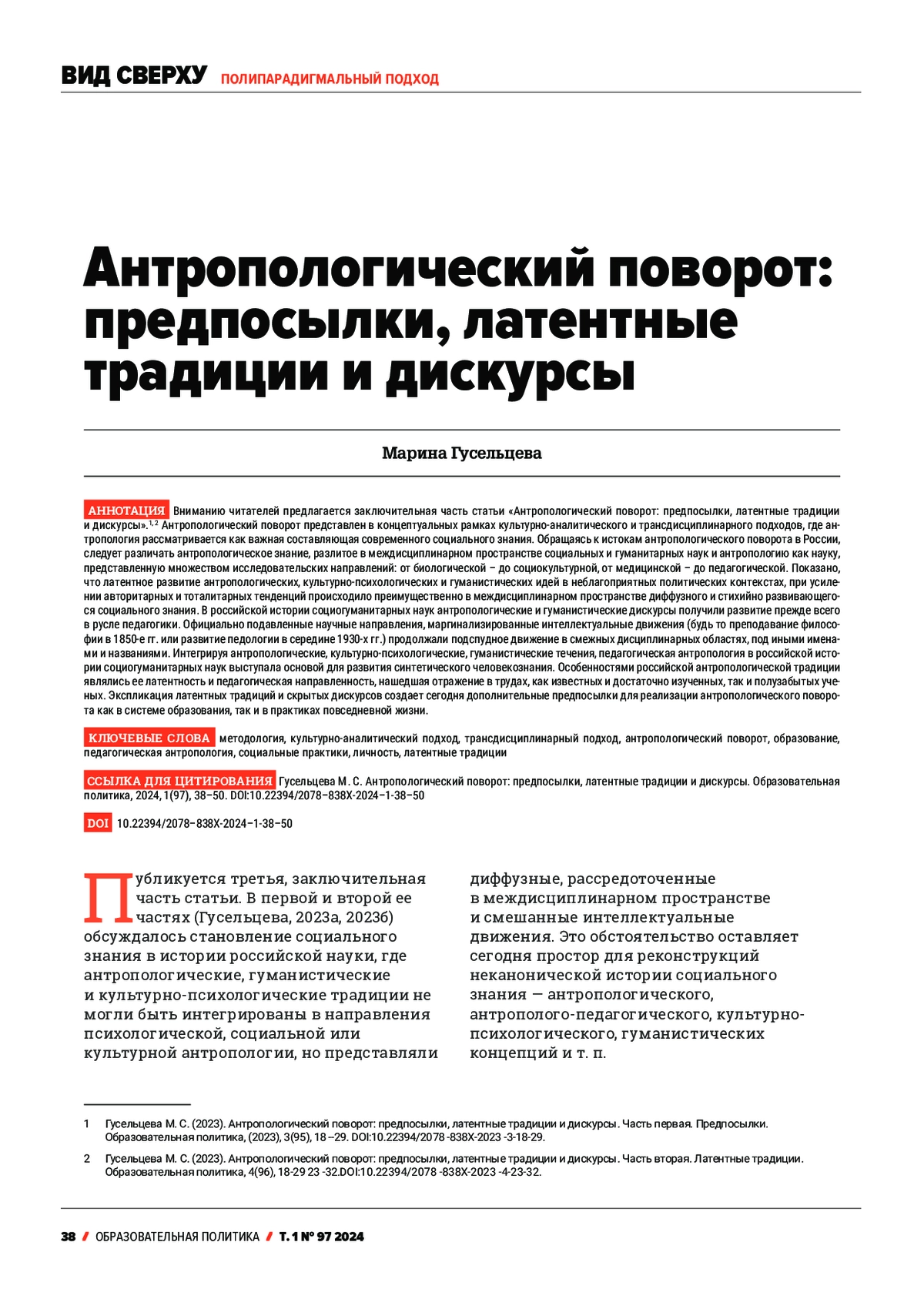 Вниманию читателей предлагается заключительная часть статьи «Антропологический поворот: предпосылки, латентные традиции и дискурсы».1, 2 Антропологический поворот представлен в концептуальных рамках культурно-аналитического и трансдисциплинарного подходов, где антропология рассматривается как важная составляющая современного социального знания. Обращаясь к истокам антропологического поворота в России, следует различать антропологическое знание, разлитое в междисциплинарном пространстве социальных и гуманитарных наук и антропологию как науку, представленную множеством исследовательских направлений: от биологической - до социокультурной, от медицинской - до педагогической. Показано, что латентное развитие антропологических, культурно-психологических и гуманистических идей в неблагоприятных политических контекстах, при усилении авторитарных и тоталитарных тенденций происходило преимущественно в междисциплинарном пространстве диффузного и стихийно развивающегося социального знания. В российской истории социогуманитарных наук антропологические и гуманистические дискурсы получили развитие прежде всего в русле педагогики. Официально подавленные научные направления, маргинализированные интеллектуальные движения (будь то преподавание философии в 1850-е гг. или развитие педологии в середине 1930-х гг.) продолжали подспудное движение в смежных дисциплинарных областях, под иными именами и названиями. Интегрируя антропологические, культурно-психологические, гуманистические течения, педагогическая антропология в российской истории социогуманитарных наук выступала основой для развития синтетического человекознания. Особенностями российской антропологической традиции являлись ее латентность и педагогическая направленность, нашедшая отражение в трудах, как известных и достаточно изученных, так и полузабытых ученых. Экспликация латентных традиций и скрытых дискурсов создает сегодня дополнительные предпосылки для реализации антропологического поворота как в системе образования, так и в практиках повседневной жизни.