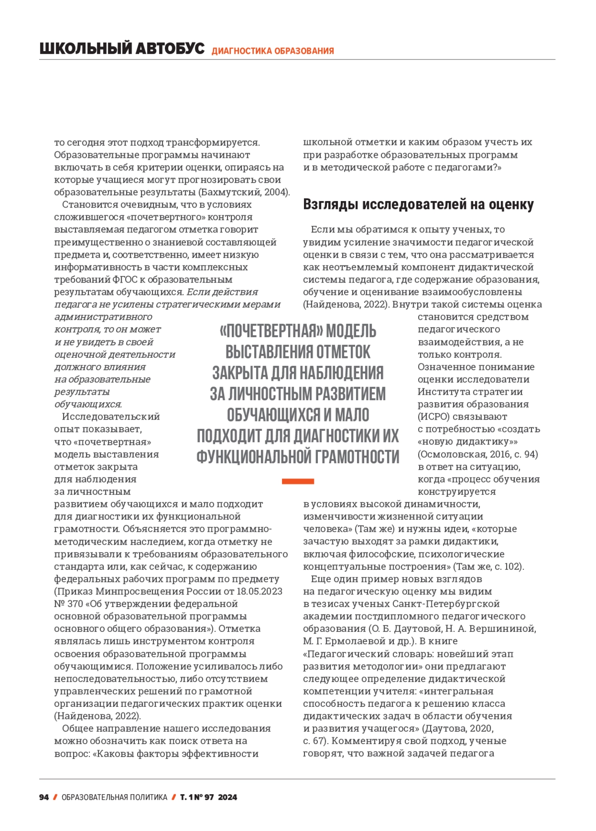 4. Найденова, Н. В. (2022). Оценивание результатов обучения в процессе стандартизации обновленного содержания общего образования в зарубежных странах. Отечественная и зарубежная педагогика, 7(6(88)), 140-157. DOI: 10.24412/2224-0772-2022-88-140-157