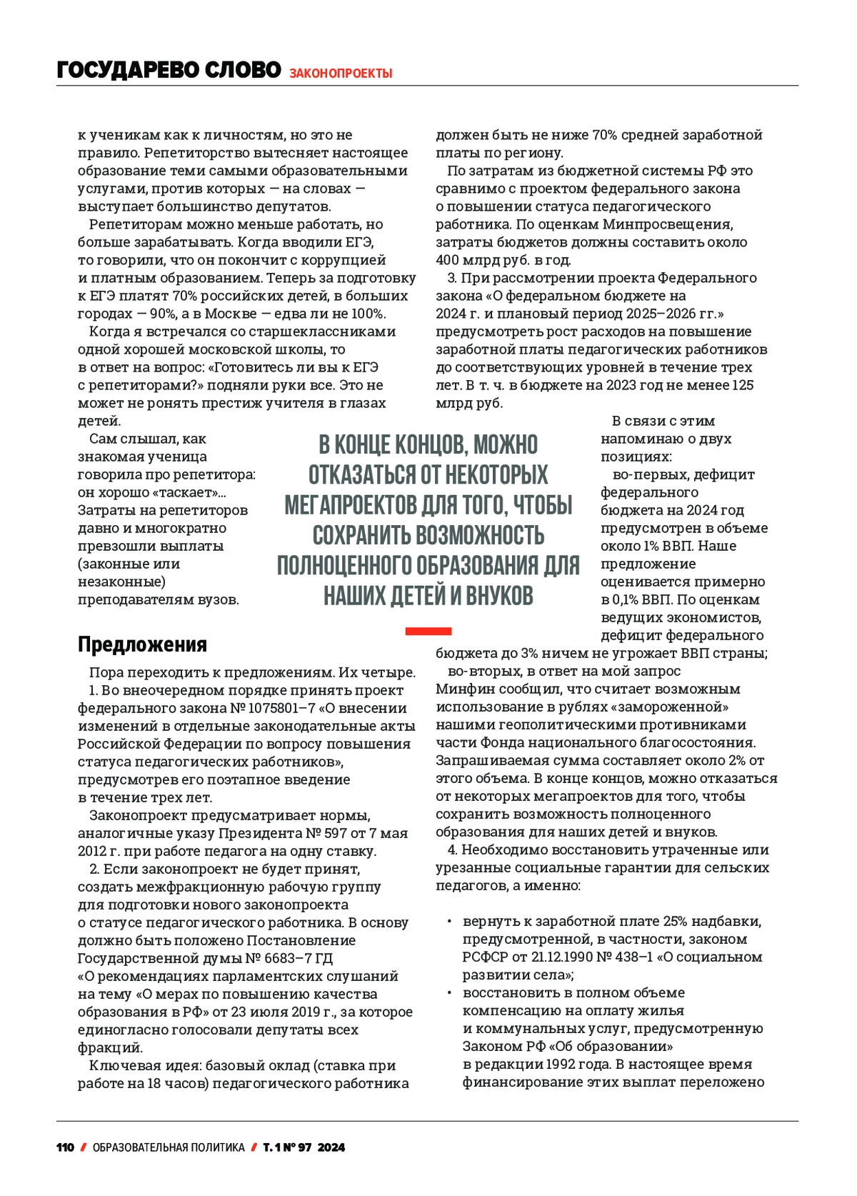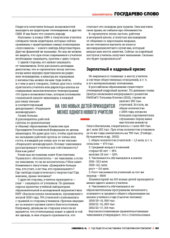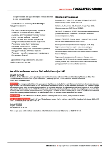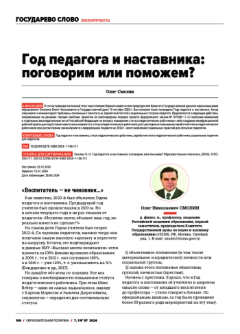 The article presents the full text of the speech given by 0leg Nikolaevich Smolin, the First Deputy Chairman of the State Duma Committee on Science and Higher Education, in the State Duma on 0ctober 10, 2023. The speech was dedicated to the Year of the Teachers and Mentors, proclaimed in 2023. The author highlights and comments on issues related to current employment, wages, and the social status of teachers. The following actions are proposed to address the current problems: urgent adoption of the draft federal law No. 1075801-7 «0n Amendments to Certain Legislative Acts of the Russian Federation Concerning the Improvement of the Status of Teaching Staff» or the creation of an inter-factional working group to prepare a new bill on the status of teaching staff; an increase in expenditures to raise teachers’ salaries when considering the draft federal law «0n the Federal Budget for 2024»; the restoration of social guarantees for rural teachers.