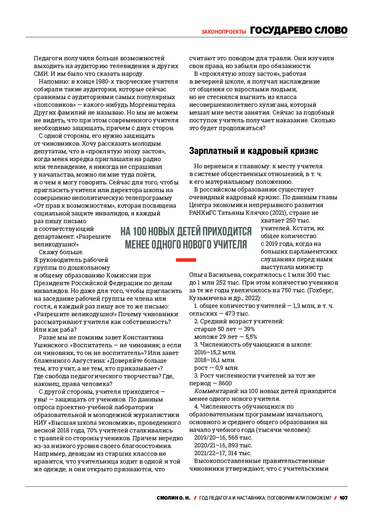 В статье приводится полный текст выступления Первого заместителя председателя Комитета Государственной думы по науке и высшему образованию Смолина Олега Николаевича в Государственной думе 10 октября 2023 г. Выступление было посвящено Году педагога и наставника. Автор озвучивает и комментирует проблемы, связанные с занятостью, заработной платой и социальным статусом педагога. Предлагаются следующие действия, направленные на решение текущих проблем: принятие во внеочередном порядке проекта федерального закона № 1075801-7 «О внесении изменений в отдельные законодательные акты Российской Федерации по вопросу повышения статуса педагогических работников» либо создание межфракционной рабочей группы для подготовки нового законопроекта о статусе педагогического работника; рост расходов на повышение заработной платы педагогических работников при рассмотрении законопроекта о федеральном бюджете на 2024 г.; восстановление социальных гарантий для сельских педагогов.