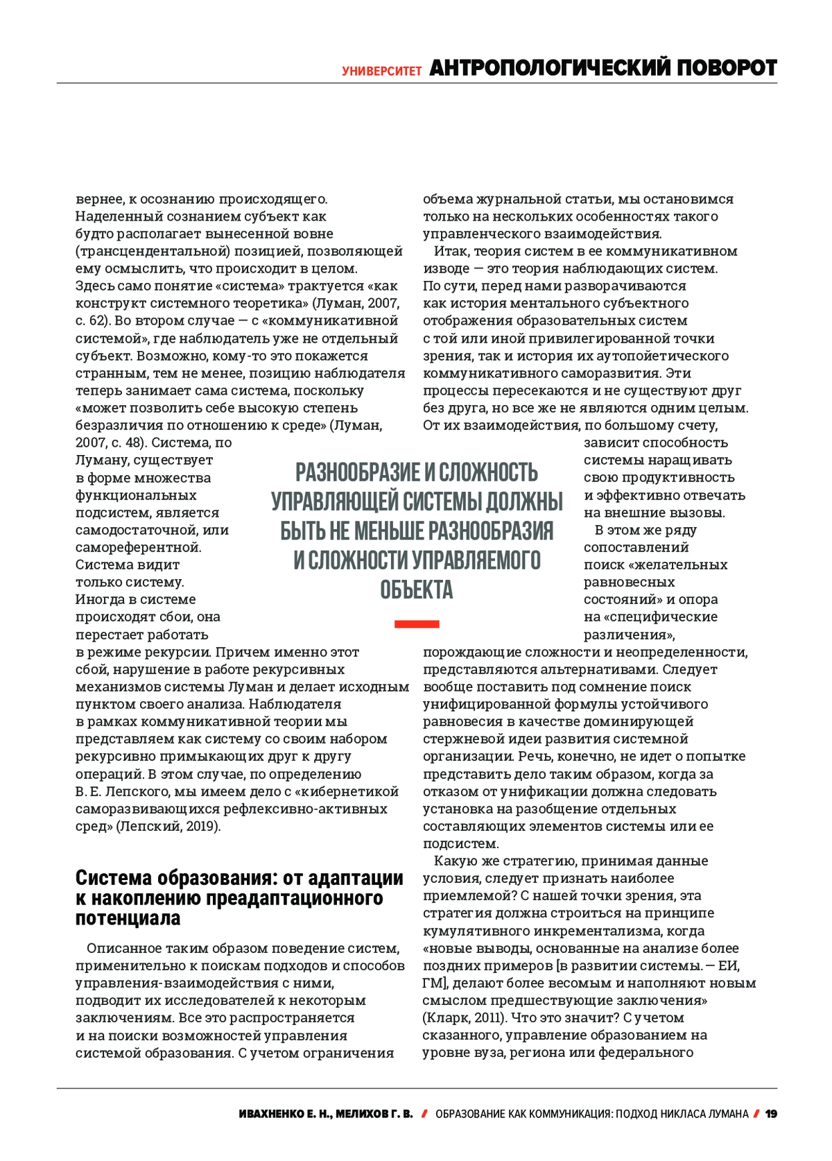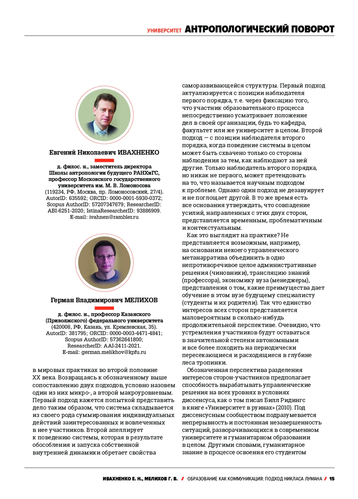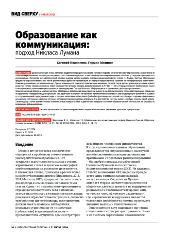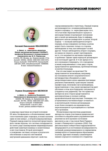Сегодня нет недостатка в количестве обращений к проблемам отечественного университетского образования. Его трудности и достижения описаны в сотнях журнальных статей и десятках монографий, опубликованных за последнее десятилетие. В настоящей статье, принимая в расчет более ранние публикации авторов (Ивахненко, 2018, 2019; Мелихов, 2012), предлагается сопоставить два подхода к осмыслению заглавной темы статьи. Один — со стороны заинтересованного, стремящегося поставить себя в позицию актора, включенного в университетскую жизнь участника образовательного процесса