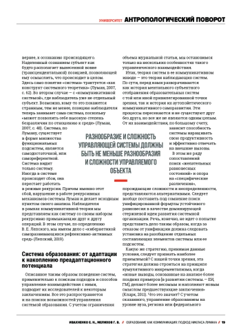 Целью настоящей статьи является продолжение разрабатываемого авторами подхода к отечественному образованию как системе и ее смысловому наполнению. Авторы рассматривают сопоставление подходов к отечественному высшему образованию как объекту социально-философского исследования. В качестве методологической основы анализа авторы выбрали системно-коммуникативную теорию Н. Лумана. Систему образования предлагается рассматривать не с точки зрения поиска единства и унификации, а с позиций предложенного Луманом ее «специфического различения». Понятие «различение», которое использует Луман, отличается по смыслу от понятия «противоречие», которое Гегель рассматривал как источник всякого развития. Истоки теории различения лежат в кибернетике второго порядка, разрабатываемой в 70-80-х гг. ХХ в. В порядке первого приближения смысл «специфического различения» приоткрывается в формулировке Грегори Бейтсона: «Информация есть различение, делающее различение». Коммуникативный подход к анализу системы образования позволил авторам прийти к выводу о предпочтительности ее преадаптационного поведения по сравнению с поведением адаптационным. Так, адаптация выступает как свойство приспособления системы к уже существующим условиям и вызовам со стороны внешней среды; преадаптация - процесс накопления избыточного (redundancy) потенциала, который способствует созданию эффективных механизмов собственного развития системы с непредсказуемыми вызовами в будущем. Эти два свойства системы являют собой две стороны одной медали. Такой подход, с точки зрения авторов, позволит лучше разобраться как в диагностике текущего состояния образовательной системы, так и в способах ее возможного реформирования.