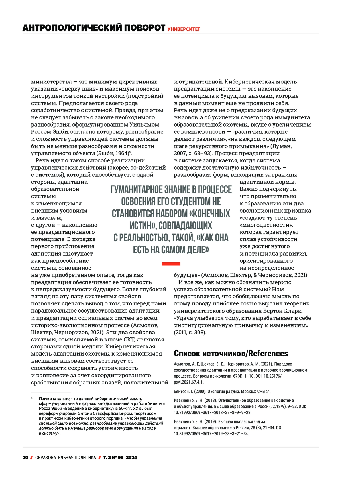 4. Ивахненко, Е. Н. (2019). Высшая школа: взгляд за горизонт. Высшее образование в России, 28 (3), 21-34. DOI: 10.31992/0869-3617-2019-28-3-21-34 EDN: ZAZDNB