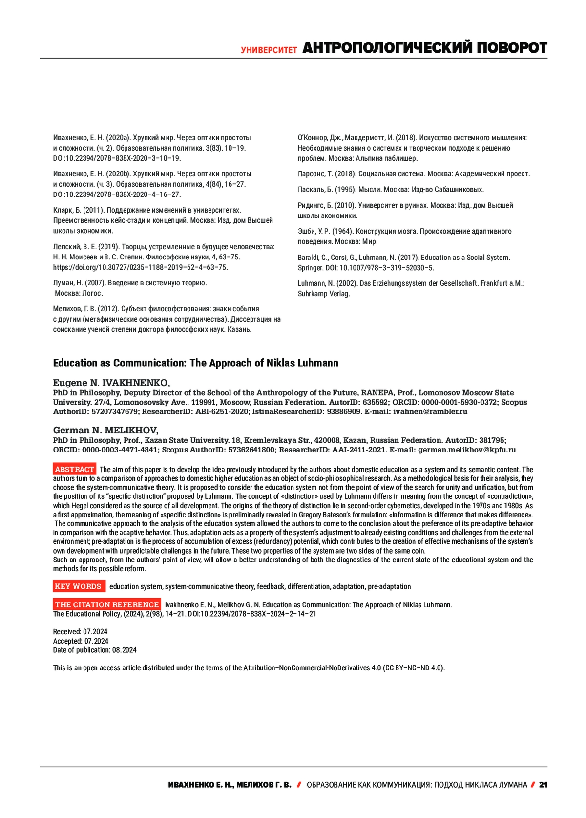 5. Ивахненко, Е. Н. (2020a). Хрупкий мир. Через оптики простоты и сложности. (ч. 2). Образовательная политика, 3(83), 10-19. DOI: 10.22394/2078-838X-2020-3-10-19 EDN: MTTZUP