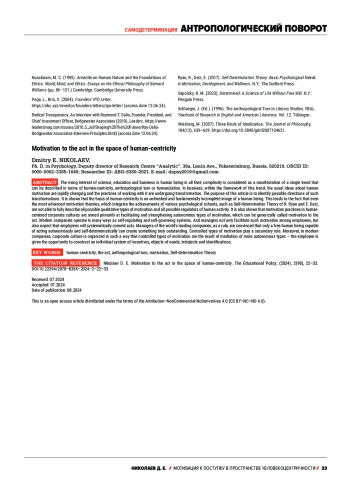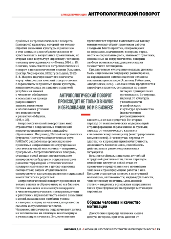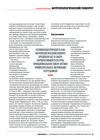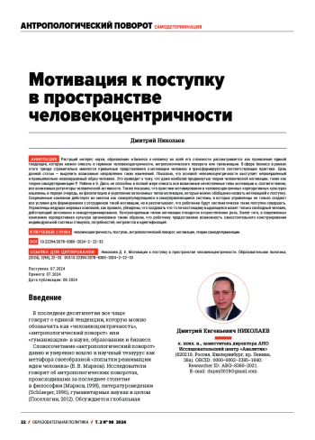 Растущий интерес науки, образования и бизнеса к человеку во всей его сложности рассматривается как проявление единой тенденции, которую можно описать в терминах человекоцентричности, антропологического поворота или гуманизации. В сфере бизнеса в рамках этого тренда стремительно меняются привычные представления о мотивации человека и трансформируются соответствующие практики. Цель данной статьи - выделить возможные направления таких изменений. Показано, что основой человекоцентричности выступает незавершенный и принципиально незавершаемый образ человека. Это приводит к тому, что даже наиболее продвинутые теории человеческой мотивации, такие как теория самодетерминации Р. Райана и Э. Диси, не способны в полной мере описать все возможные качественные типы мотивации и, соответственно, все возможные регуляторы человеческой активности. Также показано, что практики мотивирования в человекоцентричных корпоративных культурах нацелены, в первую очередь, на фасилитацию и укрепление автономных типов мотивации, которые можно обобщенно назвать мотивацией к поступку. Современные компании действуют во многом как саморегулирующиеся и самоуправляющиеся системы, в которых управленцы не только создают все условия для формирования у сотрудников такой мотивации, но и рассчитывают, что работники будут систематически такие поступки совершать. Управленцы ведущих мировых компаний, как правило, убеждены, что создавать что-то по-настоящему выдающееся может только свободный человек, действующий автономно и самодетерминированно. Контролируемым типам мотивации отводится второстепенная роль. Более того, в современных компаниях корпоративная культура организована таким образом, что работнику предоставлена возможность самостоятельного конструирования индивидуальной системы стимулов, потребностей, интроектов и идентификаций.
