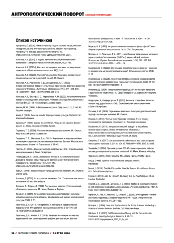 14. Гусельцева, М. С. (2022). Психология личности и антропологический дискурс: в поисках новых подходов. Вестник Санкт-Петербургского университета. Психология, 12(2), 132-149. DOI: 10.21638/spbu16.2022.203 EDN: KTBGTS