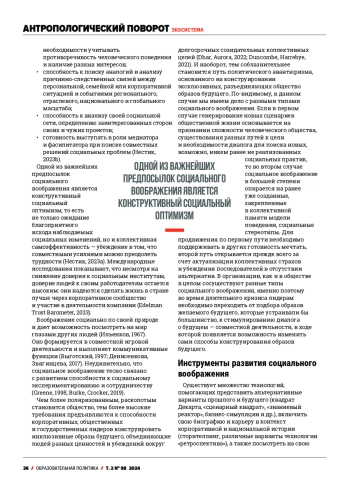 В статье рассматривается концепция социального воображения и методы его развития. Автор анализирует способность личности и сообществ воспринимать социальные события и проблемы через призму различных культурных, исторических и структурных контекстов. Социальное воображение рассматривается как ключевой навык для эффективного социального проектирования и решения сложных проблем в современном обществе. Особое внимание уделяется психологическим характеристикам и компетенциям, таким как эмпатия, временная децентрация, сценарное мышление и социальный интеллект. В статье также описываются технологические инструменты, способствующие развитию социального воображения, и приводятся примеры их практического применения.