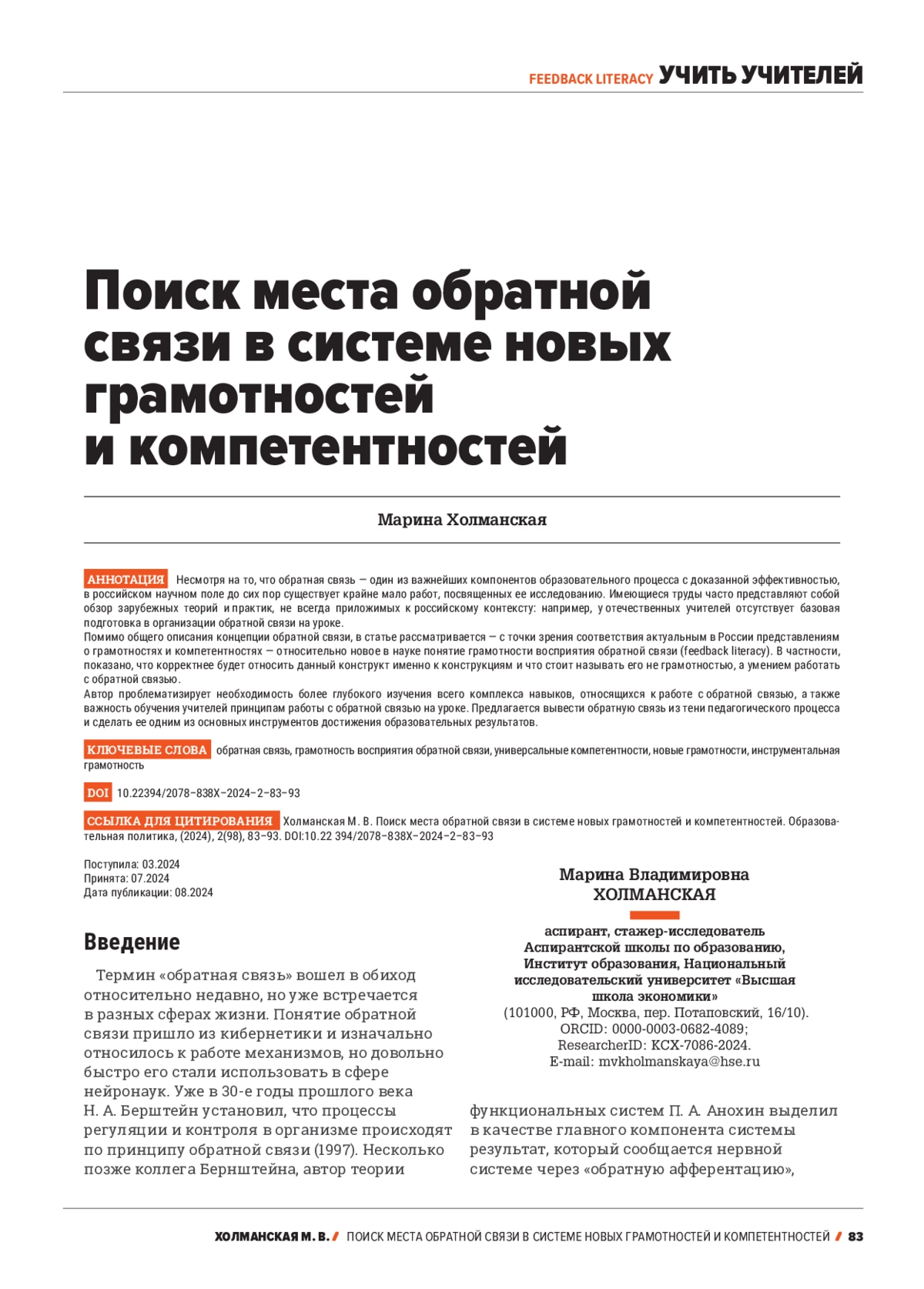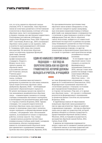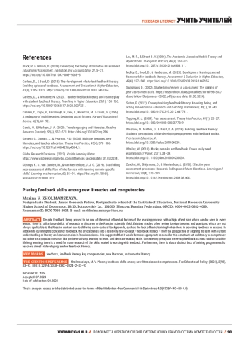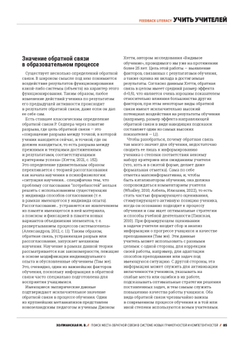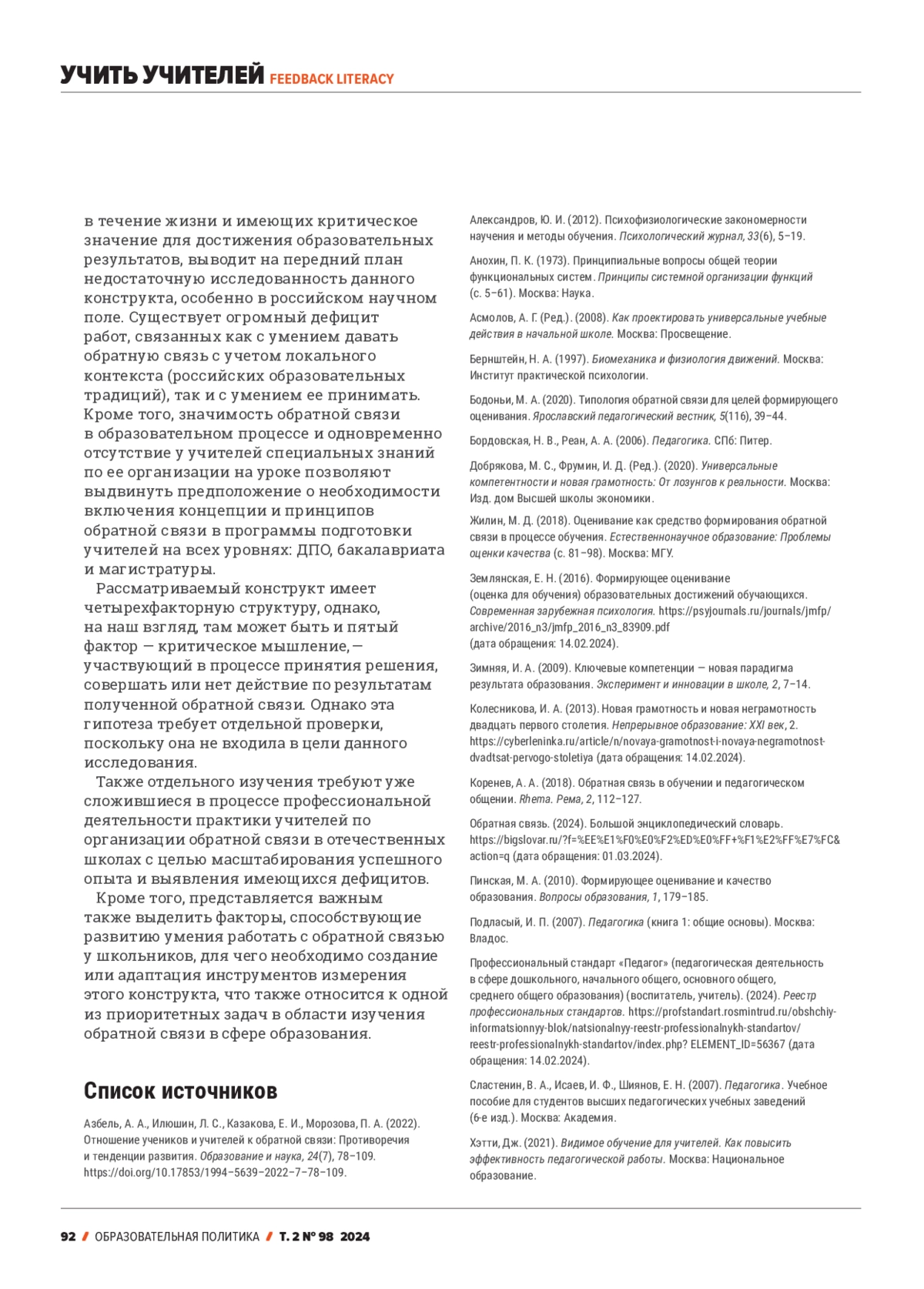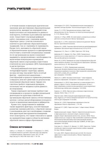 1. Азбель, А. А., Илюшин, Л. С., Казакова, Е. И., Морозова, П. А. (2022). Отношение учеников и учителей к обратной связи: Противоречия и тенденции развития. Образование и наука, 24(7), 78-109. DOI: 10.17853/1994-5639-2022-7-78-109 EDN: UYSFHS