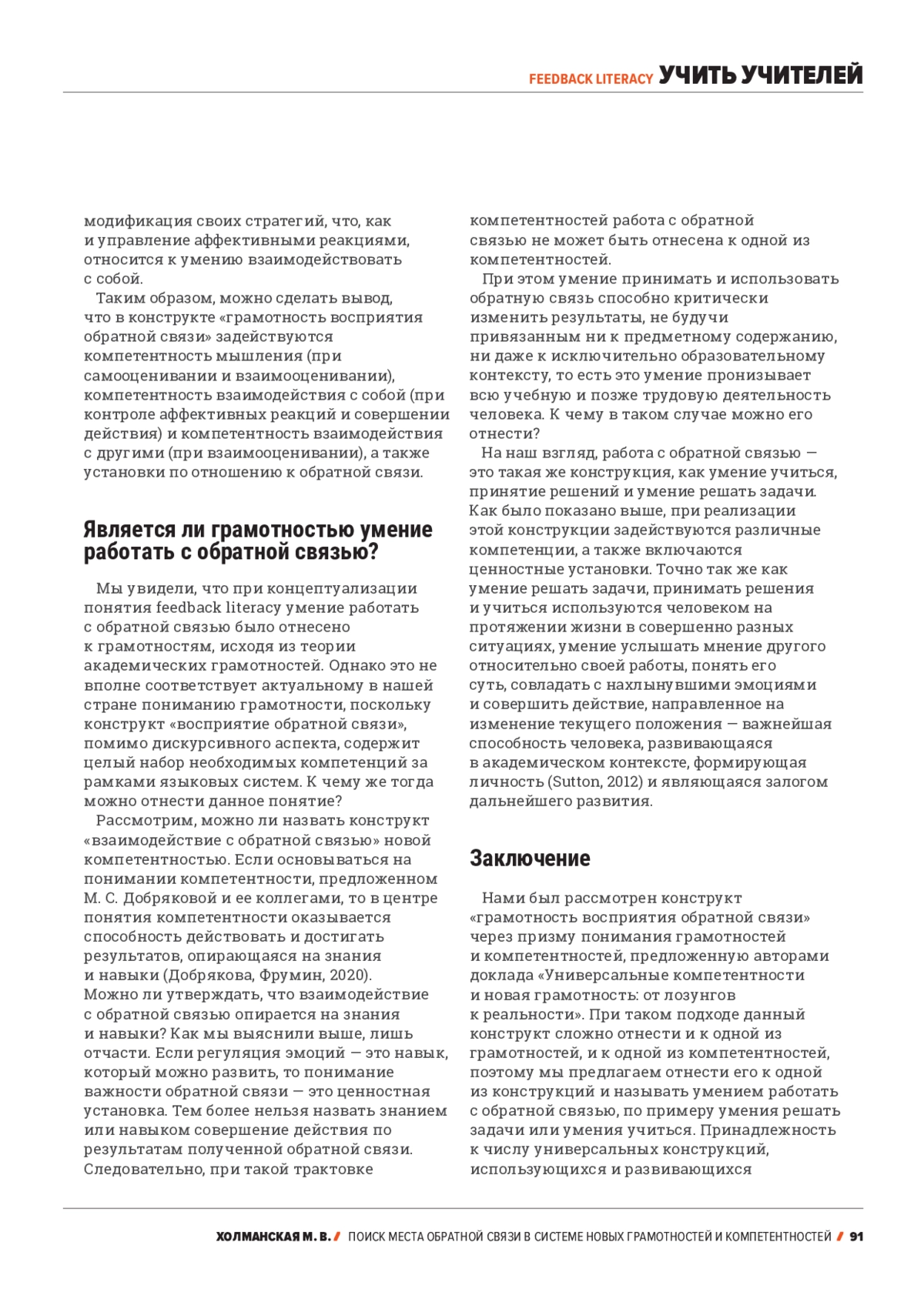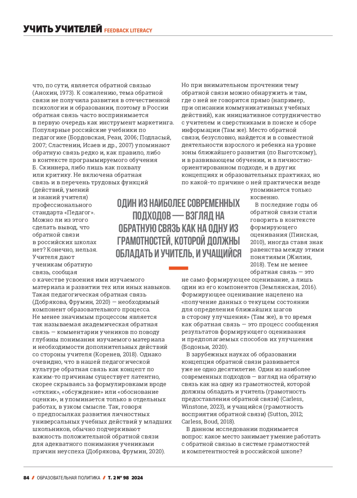 Despite feedback being proved to be one of the most influential factors of the learning process with a high effect size which can be seen in every lesson, there is still a large deficit of research in this area in the Russian scientific field. Existing studies often review foreign theories and practices, which are not always applicable to the Russian context due to differing socio-cultural backgrounds, such as the lack of basic training for teachers in providing feedback in lessons. In addition to outlining the concept of feedback, the article delves into a relatively new concept - feedback literacy - from the perspective of aligning the term with current understanding of literacy and competencies in Russian science. It is suggested that it would be more appropriate to consider this construct not as literacy or competency but rather as a popular construct like problem-solving, learning to learn, and decision-making skills. Considering giving and receiving feedback as meta skills crucial for lifelong learning, there is a need for more research of the skills related to working with feedback. Furthermore, there is also a distinct lack of training programmes for teachers aimed at developing teacher feedback literacy.