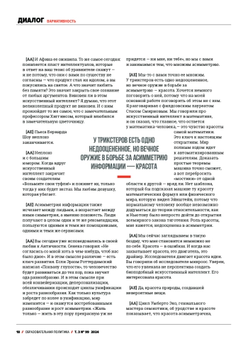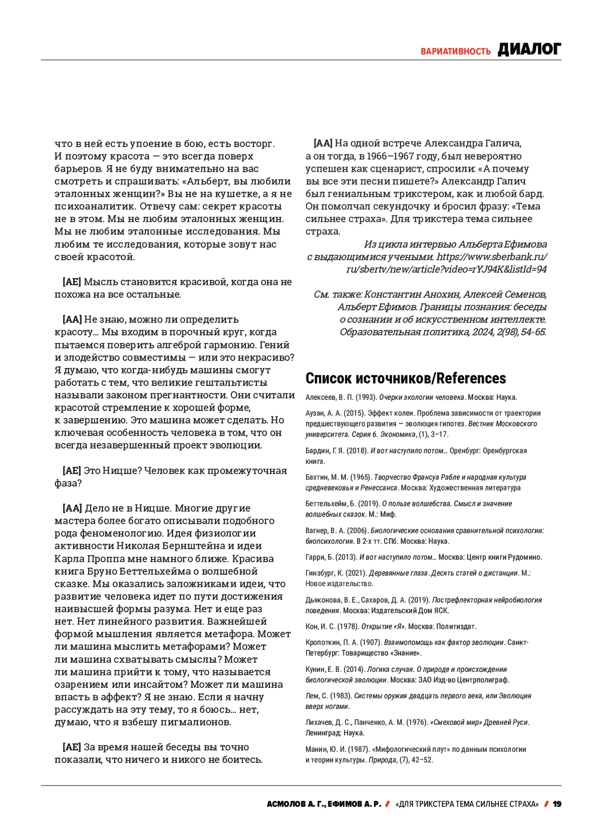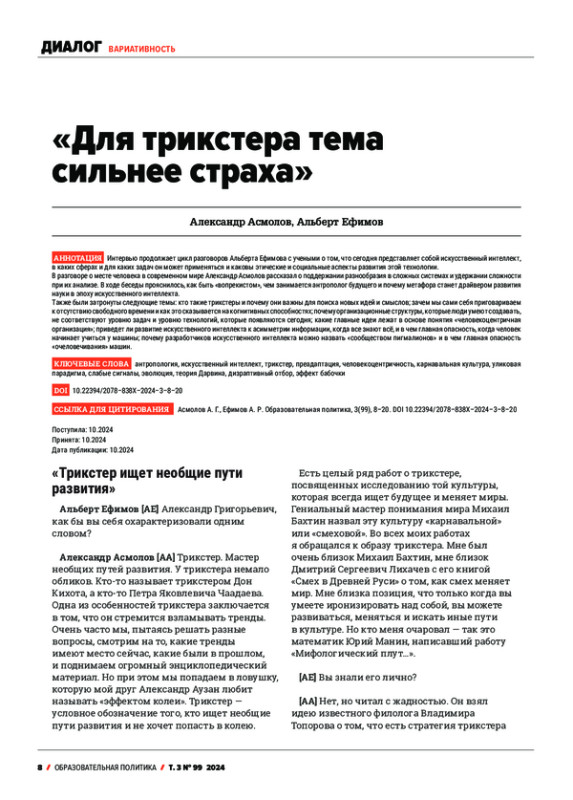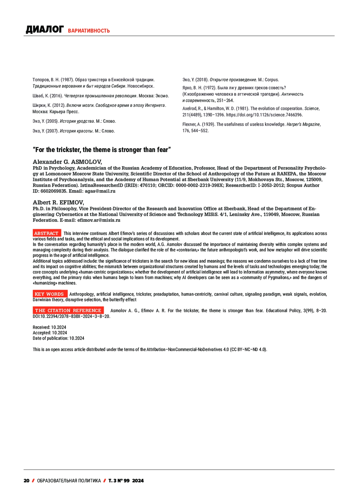 This interview continues Albert Efimov’s series of discussions with scholars about the current state of artificial intelligence, its applications across various fields and tasks, and the ethical and social implications of its development. In the conversation regarding humanity’s place in the modern world, A. G. Asmolov discussed the importance of maintaining diversity within complex systems and managing complexity during their analysis. The dialogue clarified the role of the «contrarian,» the future anthropologist’s work, and how metaphor will drive scientific progress in the age of artificial intelligence. Additional topics addressed include: the significance of tricksters in the search for new ideas and meanings; the reasons we condemn ourselves to a lack of free time and its impact on cognitive abilities; the mismatch between organizational structures created by humans and the levels of tasks and technologies emerging today; the core concepts underlying «human-centric organizations»; whether the development of artificial intelligence will lead to information asymmetry, where everyone knows everything, and the primary risks when humans begin to learn from machines; why AI developers can be seen as a «community of Pygmalions,» and the dangers of «humanizing» machines.