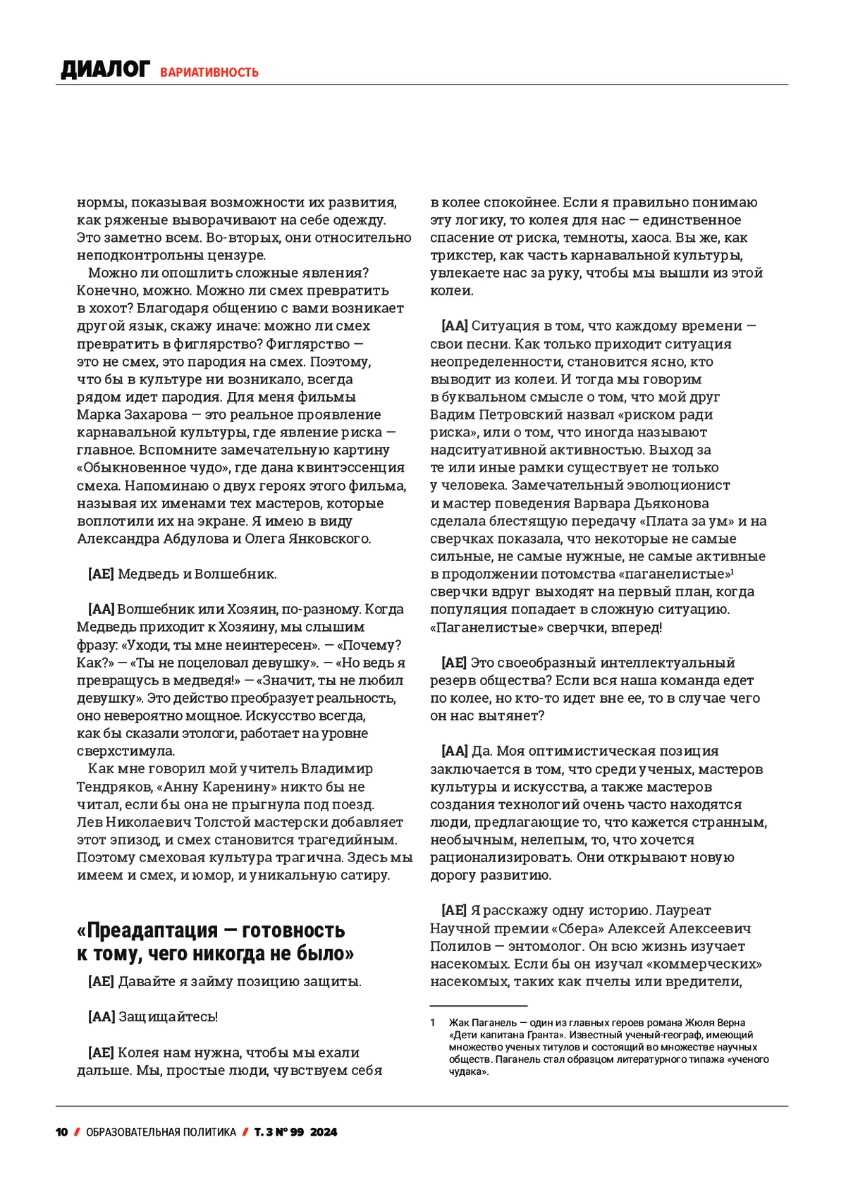 Александр Асмолов [АА] Трикстер. Мастер необщих путей развития. У трикстера немало обликов. Кто-то называет трикстером Дон Кихота, а кто-то Петра Яковлевича Чаадаева. Одна из особенностей трикстера заключается в том, что он стремится взламывать тренды. Очень часто мы, пытаясь решать разные вопросы, смотрим на то, какие тренды имеют место сейчас, какие были в прошлом, и поднимаем огромный энциклопедический материал. Но при этом мы попадаем в ловушку, которую мой друг Александр Аузан любит называть «эффектом колеи». Трикстер — условное обозначение того, кто ищет необщие пути развития и не хочет попасть в колею