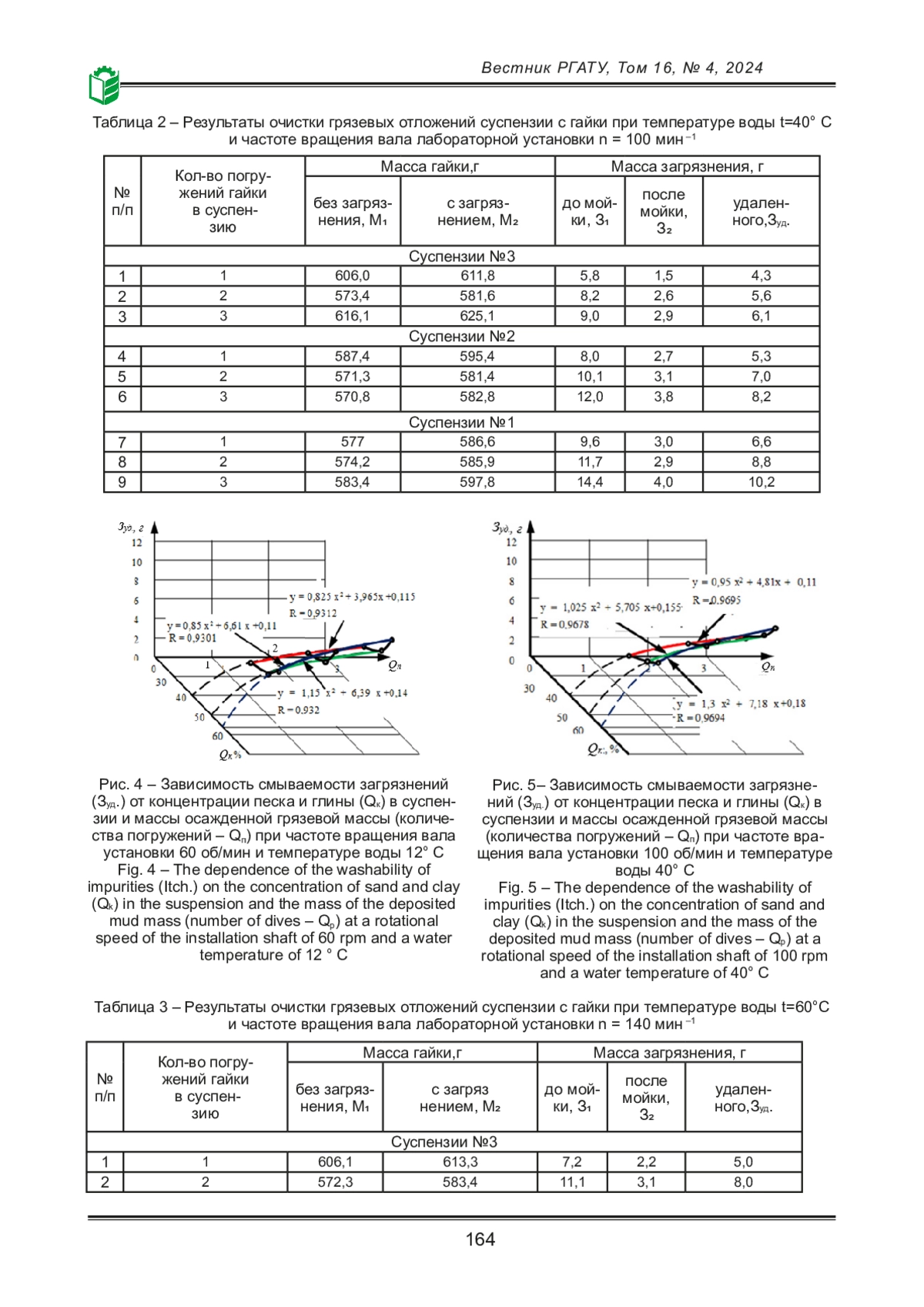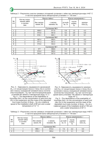 Заключение. Проведённые исследования удаления осажденной на детали песчано-глинистой суспензии показали, что процесс описывается нелинейной зависимостью, причём, с увеличением температуры и частоты вращения вала редуктора эффективность смыва грязевых отложений с детали возрастает.