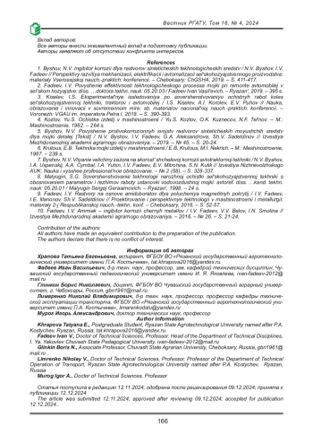 1. Бышов, Н.В. Ингибитор коррозии для растворов синтетических технологических средств /Н.В. Бышов, И.В. Фадеев // Перспективы развития механизации, электрификации и автоматизации сельскохозяйственного производства: материалы Всероссийской науч.- практич. конференции. - Чебоксары: ЧГСХА, 2019. - С. 411-417. EDN: SRQHDS